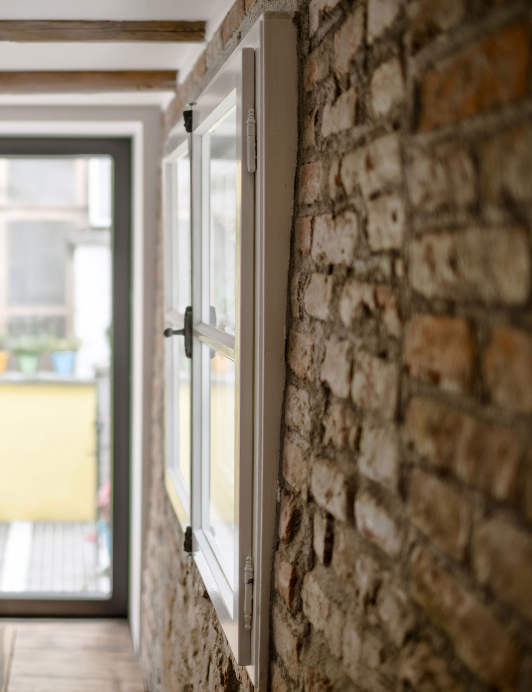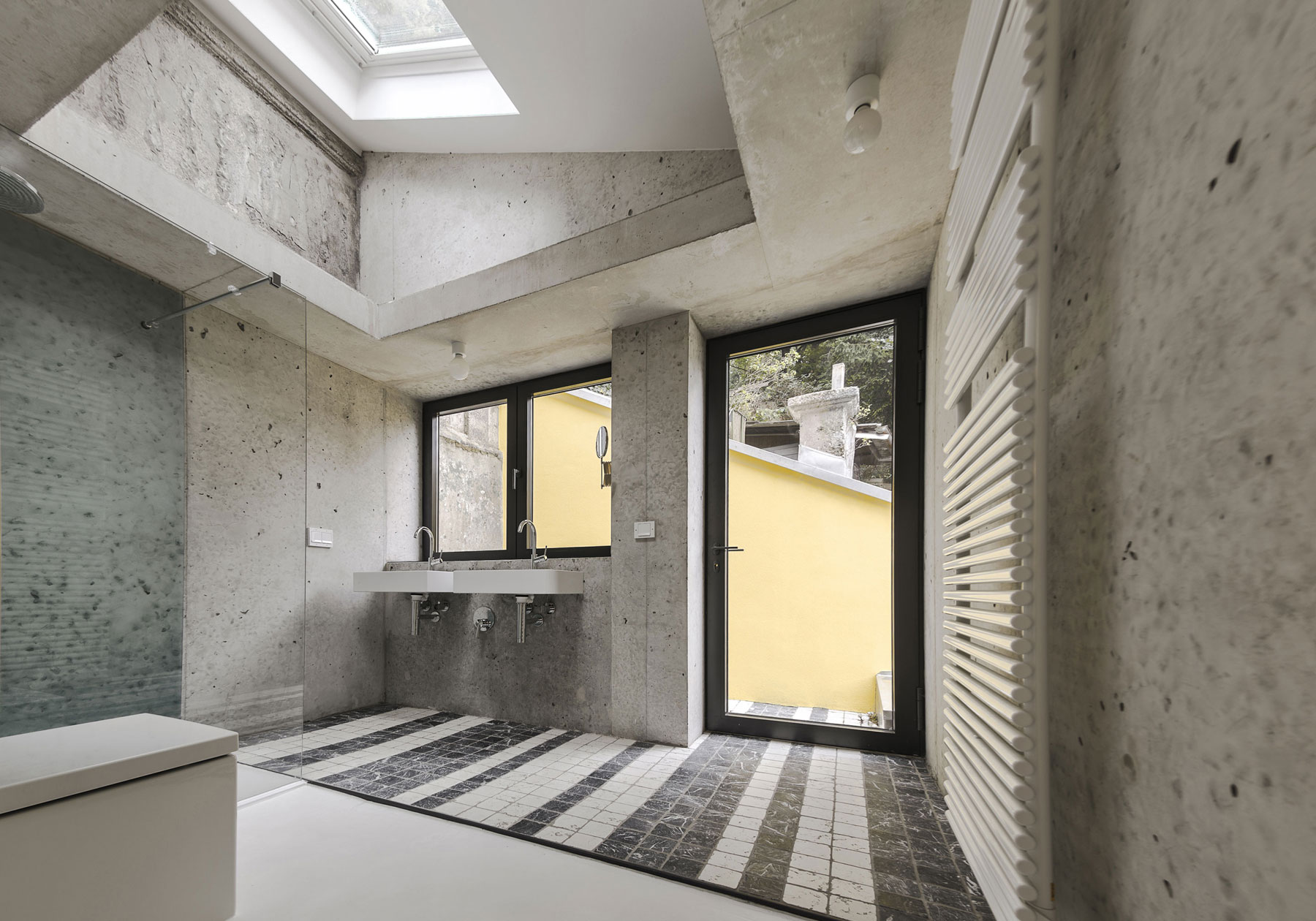Nová strecha z ručného falcovaného plechu sa nachádza presne na rovnakom mieste ako pôvodná, pričom jej vzhľad je pokiaľ ide o jej vyhotovenie veľmi podobný jej predchodkyni. Typické podlhovasté strešné okná sú v početnom množstve roztrúsené po celej ploche a vnášajú do interiéru slnečné svetlo a vzduch, čím sa vyvažuje hustá zástavba a severná orientácia pozemku.Ruina tak mohla vďaka betónovej konštrukcii opäť ožiť. Výsledkom je súhra medzi starým a novým, ktorá je čitateľná nielen vo forme, ale aj vo funkcii a využití. Kontrast prepožičiava tomuto nováčikovi charakter a starcovi zas obývateľnosť. Tak sa pretavili aj napriek tvrdým líniám do jedného spoločného celku.