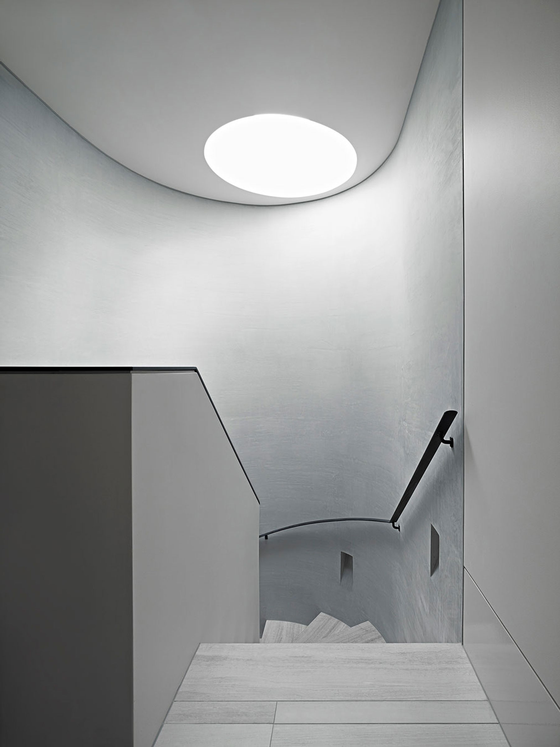 Oblúkovitý tvar schodiska je v ostrom kontraste s hranatými rysmi zvyšku budovy. Je akýmsi oddeľovačom jednotlivých funkčných zón v dome – dennej, letnej zóny, ktorá smeruje na sever a ponúka výhľad na bazén a vonkajšiu jedáleň; a na druhej strane nočnej, zimnej zóny, ktorá smeruje na juh a východ do chránenej zadnej záhrady.