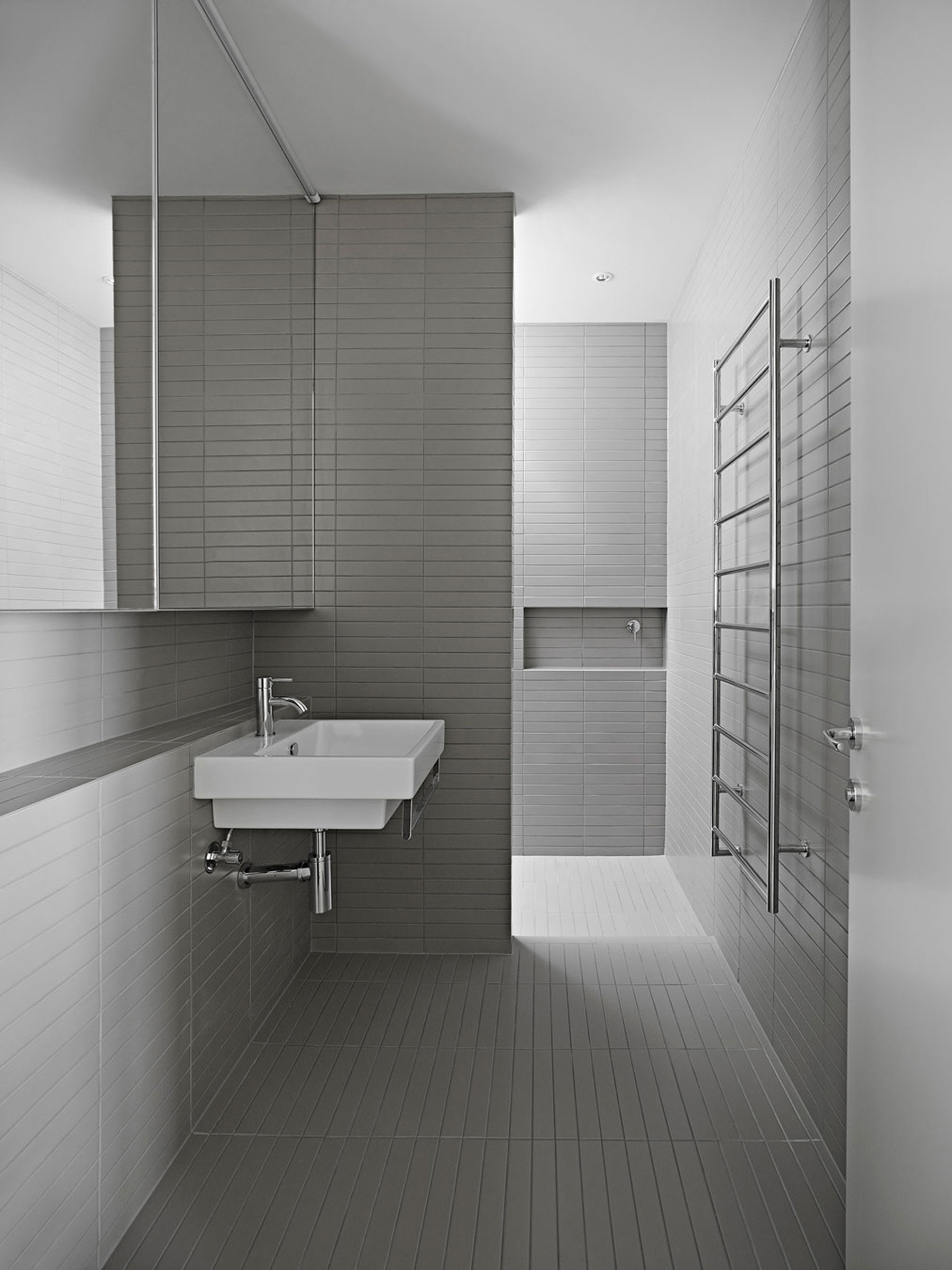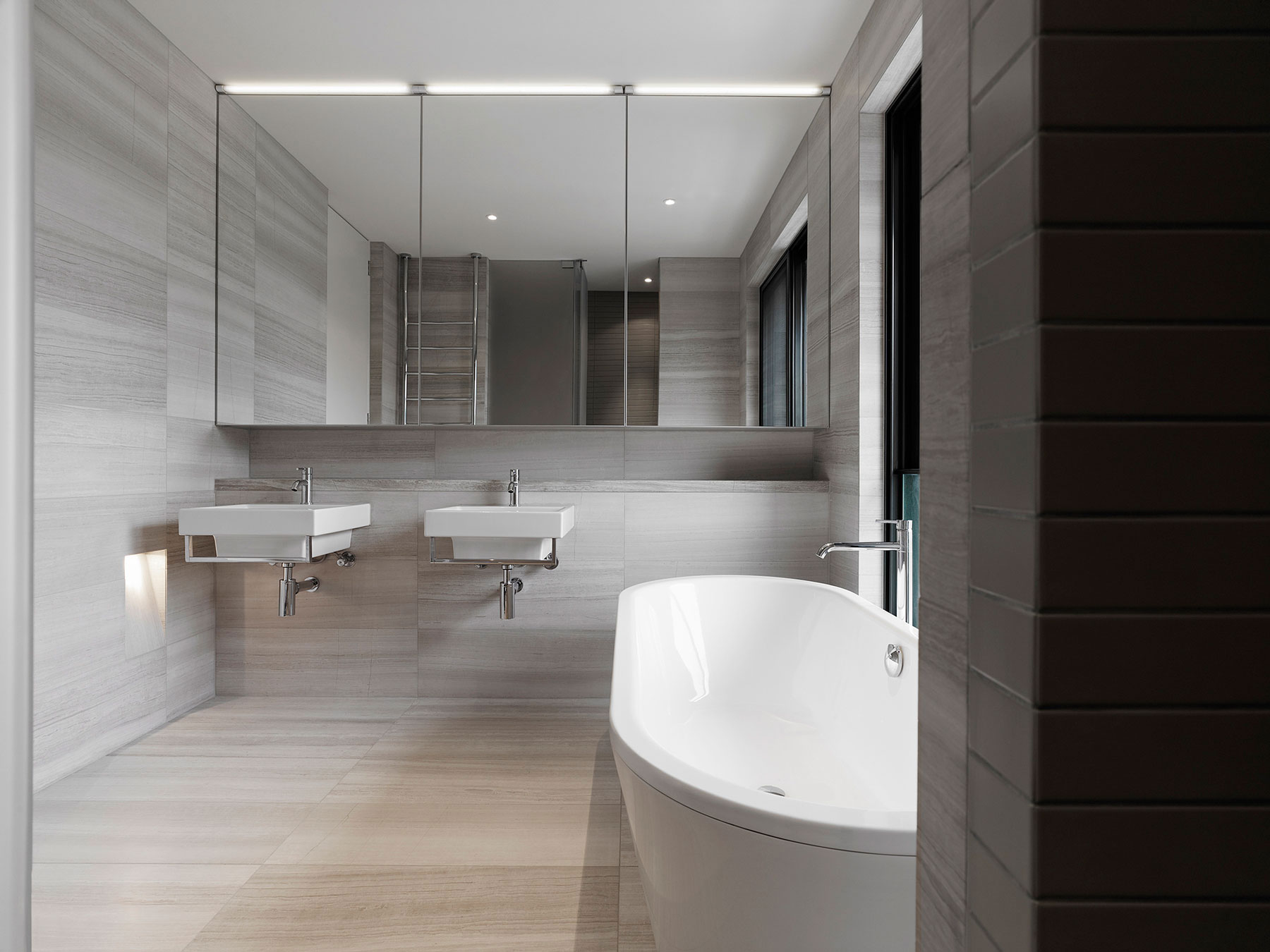 Travertín našiel svoje uplatnenie ešte okrem kuchynskej podlahy aj v kúpeľni, ktorá je ním doslova zaplavená. Bloky travertínového obkladu architekti aplikovali nielen ako podlahový materiál, ale aj ako obklad stien a základ pre poličku nad umývadlami. Kúpeľne sú skutočne minimalistické a pôsobia z celého interiéru azda najchladnejšie.