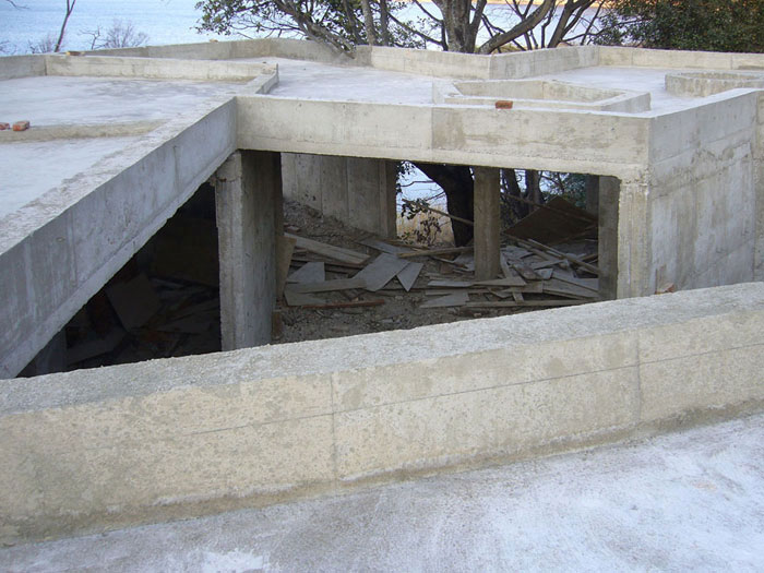 Komplikovaný pôdorys domu kontrastuje s jednoduchosťou použitých materiálov a samotných detailov. Pohľadový betón v exteriéri aj interiéri sa lial do bambusového debnenia.