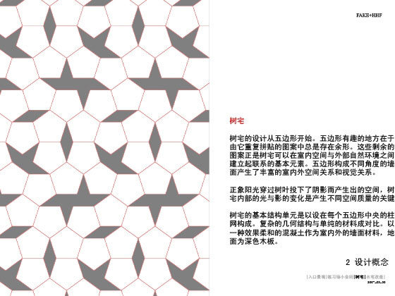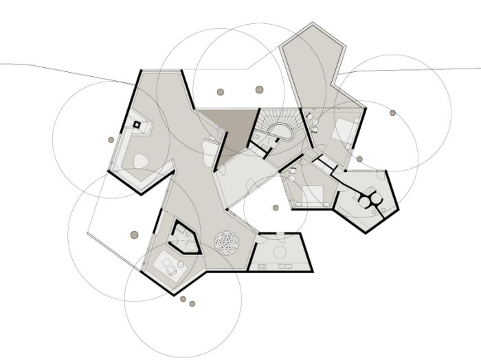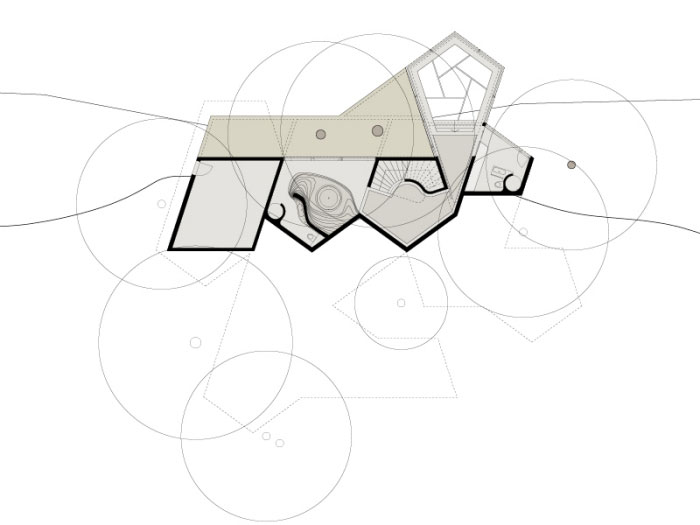 Dispozícia dvojpodlažnej betónovej stavby je vytvorená na základe opakujúceho sa motívu päťuholníka. Tento koncept je zaujímavý tým, že veľké zoskupenia takýchto obrazcov sa nedajú vytvoriť bez toho, aby v pôdoryse domu neostali prázdne miesta. A tieto prázdne miesta sa stali pri tomto projekte kľúčovými – vytvárajú zaujímavé svetelné situácie, spájajú interiér domu s okolitým prostredím a integrujú jestvujúce stromy do vznikajúcich terás.