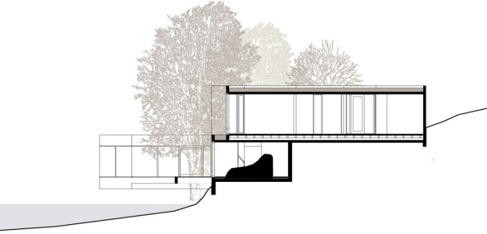 Dom je čiastočne vykonzolovaný ponad jazero.