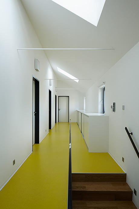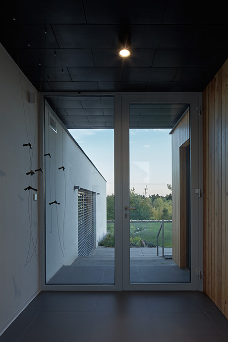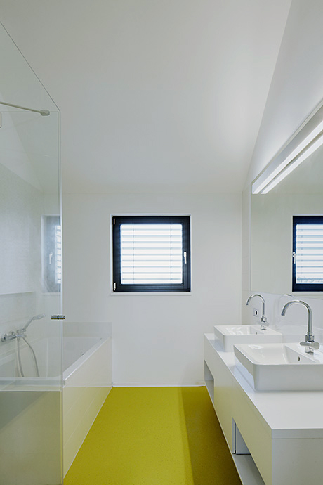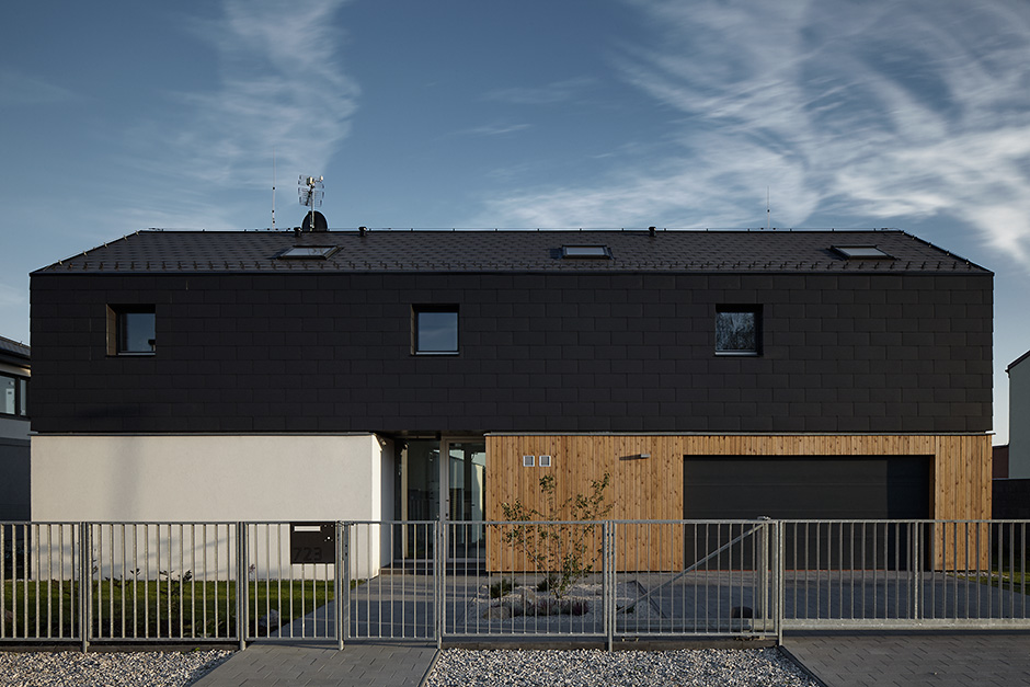 Zvonku kompaktne pôsobiaca „drevostavba“ je narušená iba garážovými dverami. Tmavé poschodie ukrýva žiarivý interiér, v ktorom prevažuje biela a žltá farba. Pomerne netradičná žltá podlaha je v ostrom kontraste s exteriérovým obkladom, vďaka čomu je dom vyvážený a pôsobí živo a dynamicky. Poschodie so štedrou výškou a klasickými štvorcovými oknami, zaliate svetlom prostredníctvom strešných svetlíkov, je ideálnym priestorom na relaxačné časti domu (spálne či kúpeľne).