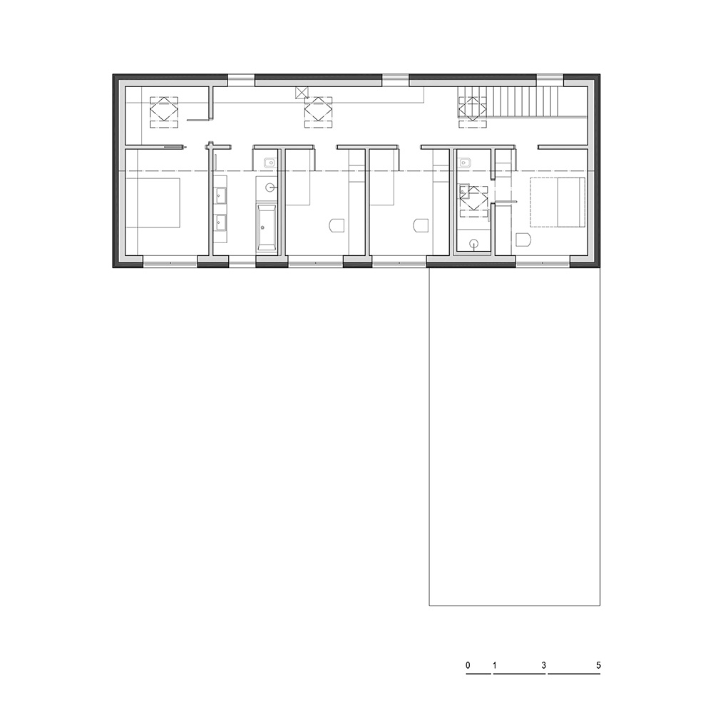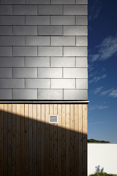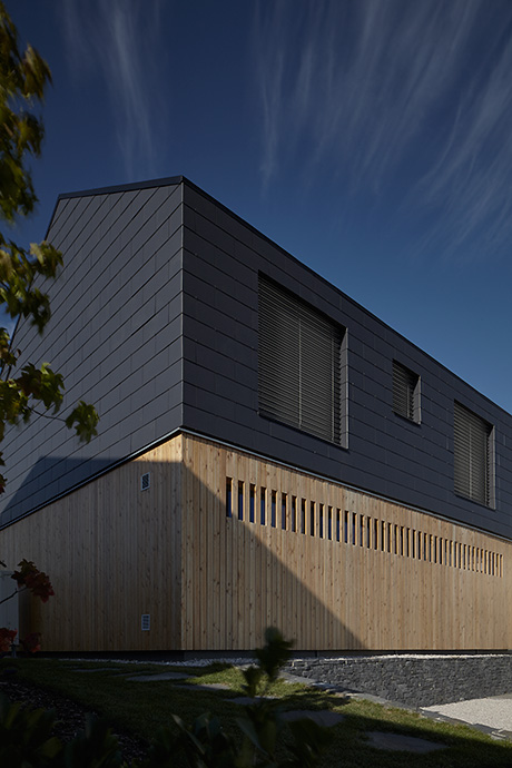 Obidve prízemné časti spája dlhý hranol v tvare nízkeho domu, ktorého povrchový finiš je veľmi netradičný – okrem sedlovej strechy sú totiž strešnými eternitovými šablónami pokryté aj vonkajšie steny poschodia. Celé opláštenie tejto nadzemnej časti teda tvorí tmavý obklad v rozmere 60 x 30 cm typu „anglický obdĺžnik“. Poschodová časť je nasmerovaná k slnku a dominuje celej stavbe nielen priestorovo a tvarovo, ale aj farebne a povrchovou štruktúrou.