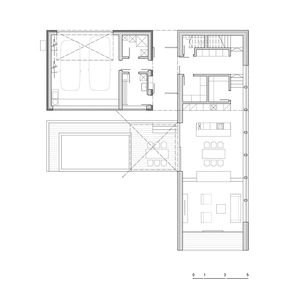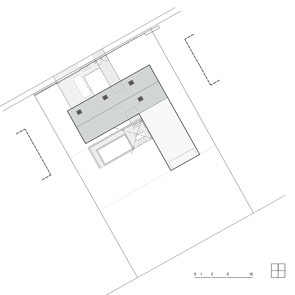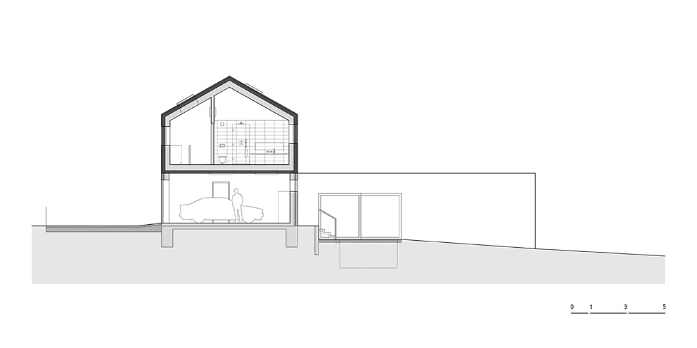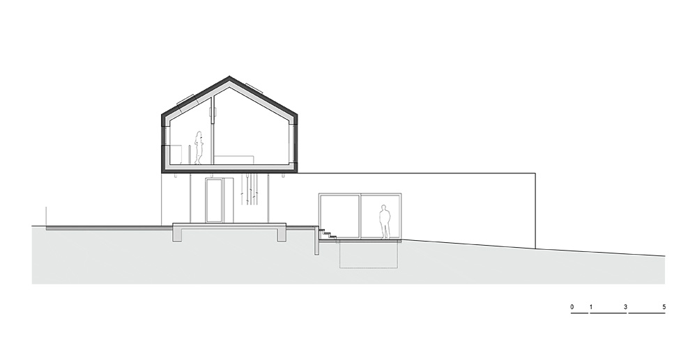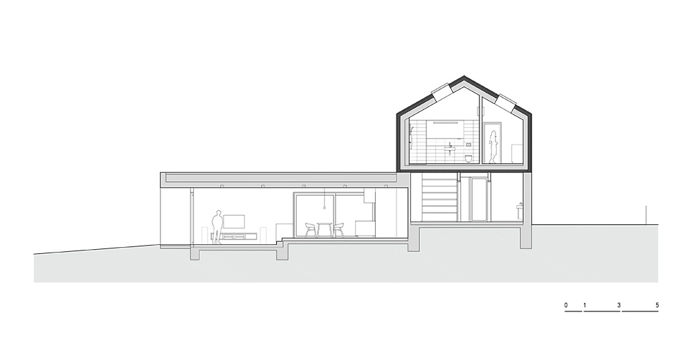 Jednotlivé časti vyzerajú ako osobitné celky, avšak spolu tvoria harmonickú sústavu. Zadná časť, ktorá je otvorená smerom do záhrady, je jednoduchá, biela, s veľkým presklením v rámci obývačky. Je vsadená do svahu. Susediaca prízemná časť, ktorá sa tiahne smerom k ulici, tvorí akúsi bariéru medzi záhradou a ulicou a tým pádom zabezpečuje súkromie majiteľov. Táto časť je obložená vertikálne postavenými drevenými latkami.
