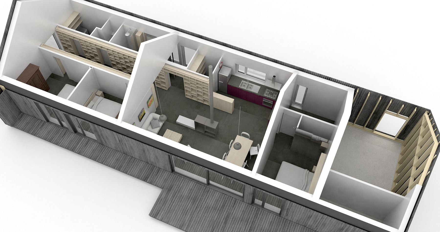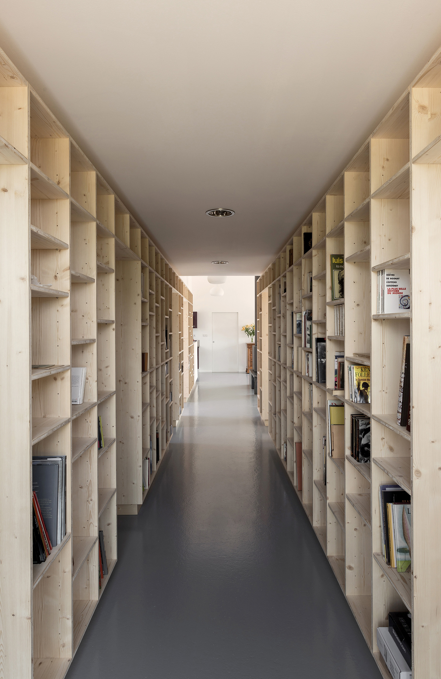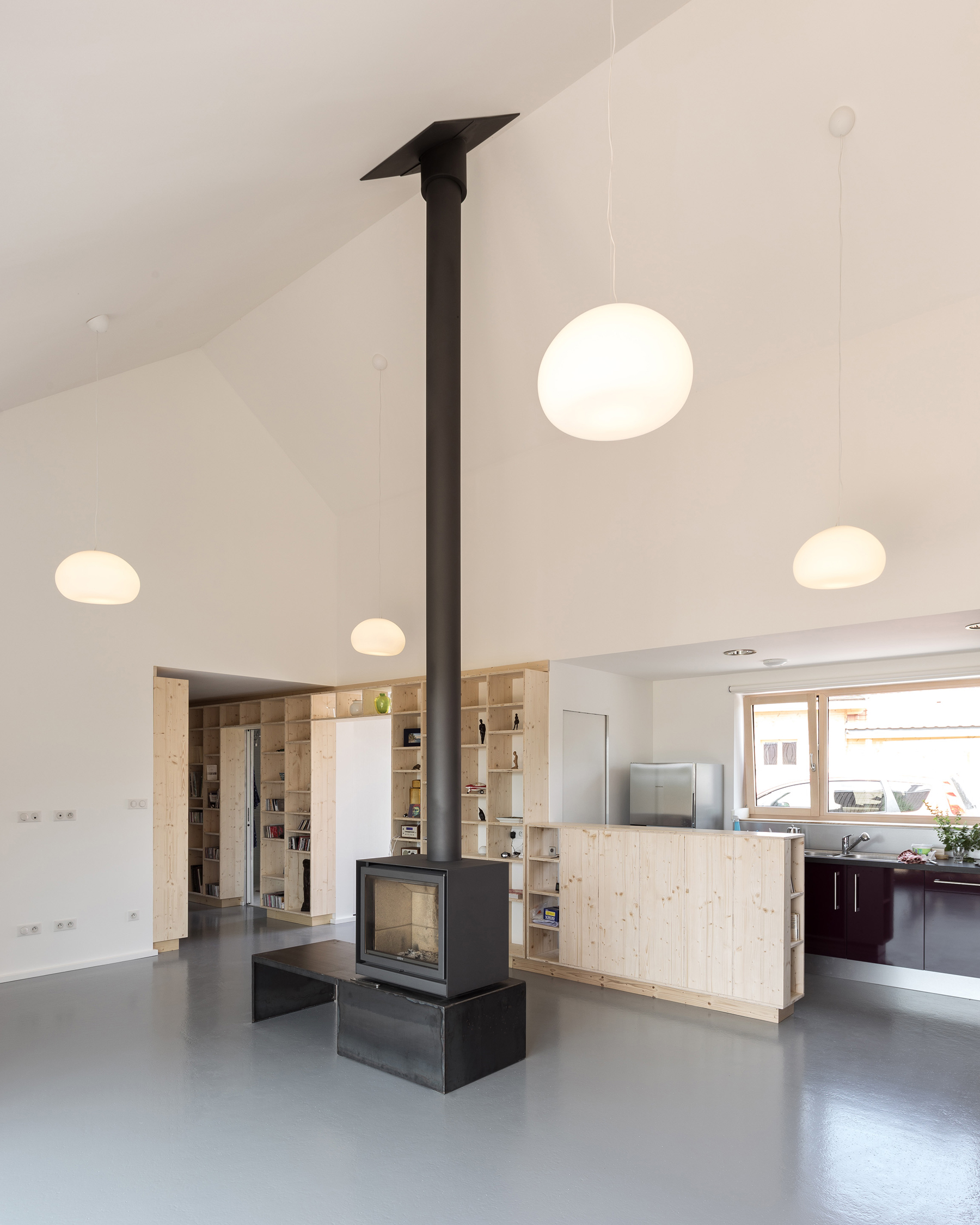 Pokiaľ ide o interiér, dom je pozdĺžne rozdelený na tri celky. Na južnej strane sa nachádzajú obytné miestnosti, v strede centrálna knižnica a na severe kúpeľňa, WC a technické miestnosti. Obývacia izba je spojená s jedálňou a kuchyňou a je charakterizovaná vysokým stropom. V srdci miestnosti sa nachádzajú kachle na drevo, ktoré zabezpečujú optimálne pohodlie počas zimy a v prechodnom období. Funkčnosť domu dopĺňa garáž a veľký podkrovný priestor.