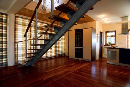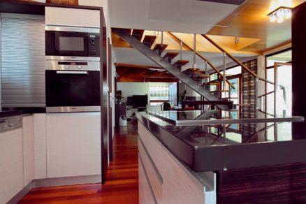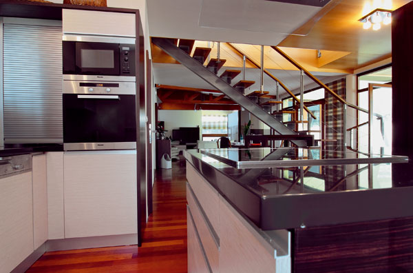 Kompozíciu vnútorného priestoru vyvažuje schodisko, ktoré sa nesie na stredovej oceľovej schodnici a napriek tomu vytvára ilúziu ľahkej konštrukcie. „Myslím si, že v tomto duchu pokračoval aj nápad s mramorovým obkladom kozuba. Problém bol iba v tom, že ak sme chceli, aby obklad vyzeral podľa našich predstáv, nenašli sme na túto prácu nikoho iného ako môjho manžela,“ zverí sa majiteľka vily.