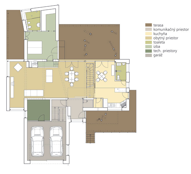 Domáci síce nemajú toľko múdrych rečí okolo svojho domu, ale náležite sú naň hrdí. Vovedú hostí cez úsporne riešenú predsieň, ktorá sa vo chvíli otvorí do rozľahlého priestoru obytnej plochy prvého nadzemného podlažia. Svetlo prestupuje zasklenými plochami dverí, ktoré otvárajú výhľad i vstup na terasu. Prúdi aj oknami obývacej či kuchynskej časti podlažia, kĺže sa priestorom a mäkko dopadá v mnohých podobách na tmavú drevenú podlahu. Zariadenie interiéru sa prihovára povrchmi z prírodných materiálov.