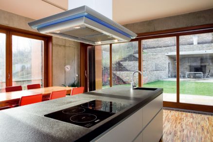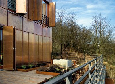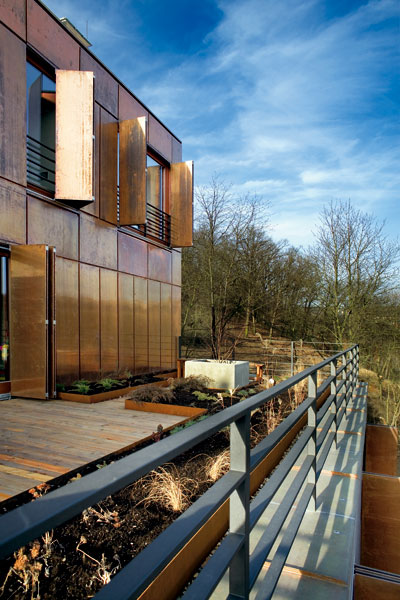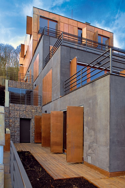 Meď a betón nenápadne dopĺňa zábradlie z ocele, schodisko z pozinkovaného plechu z vonkajšej strany domu a gabionové múry. Pergola na terase na prvom poschodí, po ktorej sa bude časom vinúť vinič, má (podľa želania architekta) tiež rovnakú podobu a je z rovnakého materiálu ako zábradlie. Dom by nevyzeral tak súčasne, keby majitelia nemali odvážneho ducha. „Pôvodne sme navrhovali tehly a drevo, investori si však priali niečo odvážnejšie, trocha viac experimentu,“ hovorí Pavel Hnilička.