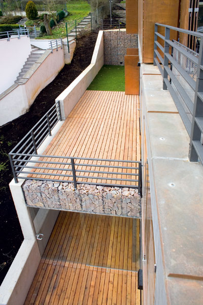 Dlažba pred vstupom do bytov aj v protiľahlej kozubovej časti je z veľkých kvádrov kremenca s teplými farbami od žltej po hnedú – ideálneho pre bosé nohy. Všetky byty majú sčasti zazelenenú strešnú terasu aj s betónovými kvetináčmi na stromy, ktoré vyrastú len natoľko, aby príliš netienili. Už teraz, po necelom roku užívania, zeleň na terasách sľubne bujnie. „Som zvedavý, ako sa dom časom zazelená viničom či brečtanom a gabiony zarastú skalničkami. Dokonca sa budem tešiť, keď betón začne obrastať machom,“ konštatuje Pavel Hnilička.