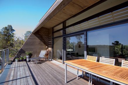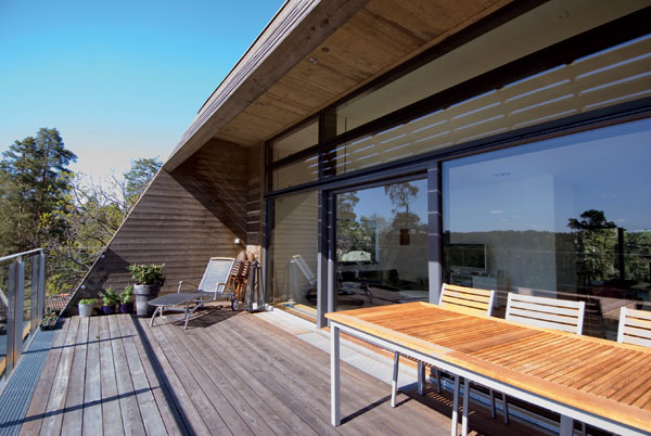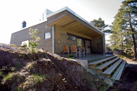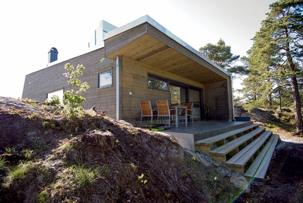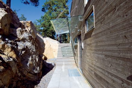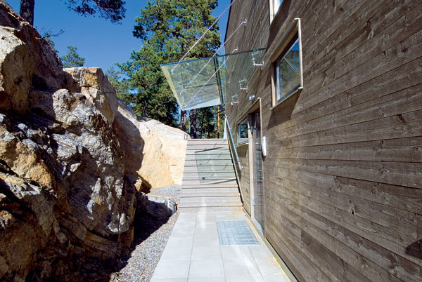 | Schody vedúce popri dome vyúsťujú na vzdialenejšom rohu. Prosto riešené schody na terasu sú ukážkou severského rebríčka hodnôt – zásah do krajiny musí byť minimálny. Tejto zásade ustupuje aj potreba reprezentatívnosti. | Vstup na podlažie so spálňami a pracovňou. Zastrešenie nad vstupom, pôsobiace, akoby sa dalo sklápať, je jedným z viacerých technicistických detailov v dome. Sklené a leštené kovové prvky tu vytvárajú kontrast s rustikálnym obkladom a drsnou skalou. |