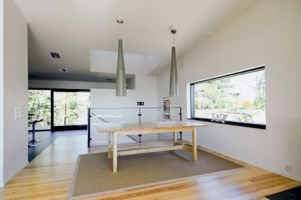Samozrejme, možno si predstaviť aj pohodlný a praktický krytý vstup od cesty, ktorý by bol pod klinom. Zaiste by sa ním vytvorila dispozícia, ktorá by bola z nášho pohľadu menej neobvyklá – so spoločenskými priestormi na dolnom a súkromnými na hornom podlaží. To by však nebol severský dom sústredený na „všednú“ krásu okolitej prírody, ale „náš“ dom, v ktorom zvyčajne tvoríme „vlastný svet“.