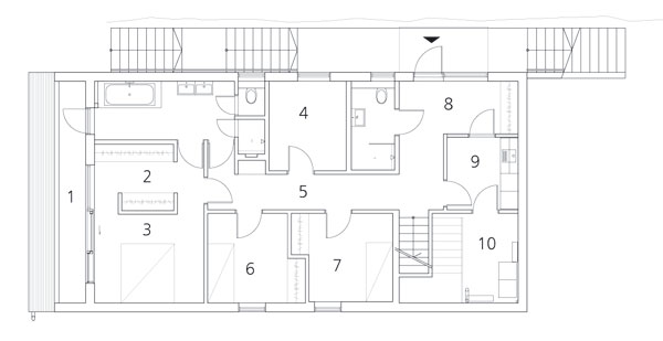| Prvé podlažie: 1 – terasa, 2 – šatník, 3 – spálňa, 4 – pracovňa, 5 – chodba, 6 – spálňa, 7 – spálňa, 8 – vstup, 9 – práčovňa, 10 – technické zariadenia | Druhé podlažie: 1 – lodžia, 2 – obývacia izba, 3 – jedáleň, 4 – kuchyňa, 5 – terasa |