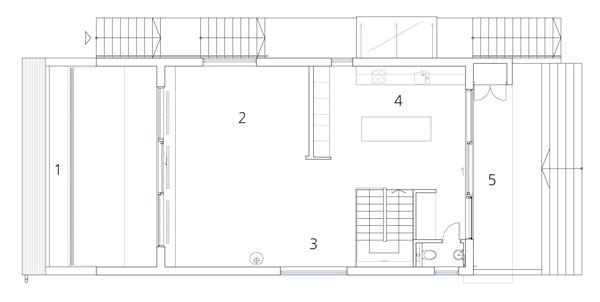 Okná dvoch menších spální s vlastnou kúpeľňou vychádzajú na dlhšiu stranu, protiľahlú tej, kade vedú vonkajšie schody. Keďže vzadu, vzhľadom na riešenie prístupu, nemôže byť ani reči o súkromnej zóne, funkciu klasickej záhradnej, ľahšej a neformálnej fasády preberá spomínaná bočná strana. Jej drevený obklad má schodovitú dolnú líniu, čo pripomína komunikáciu na opačnej strane a zároveň vytvára dojem krehkej nadstavby na mohutnom betónovom bloku.