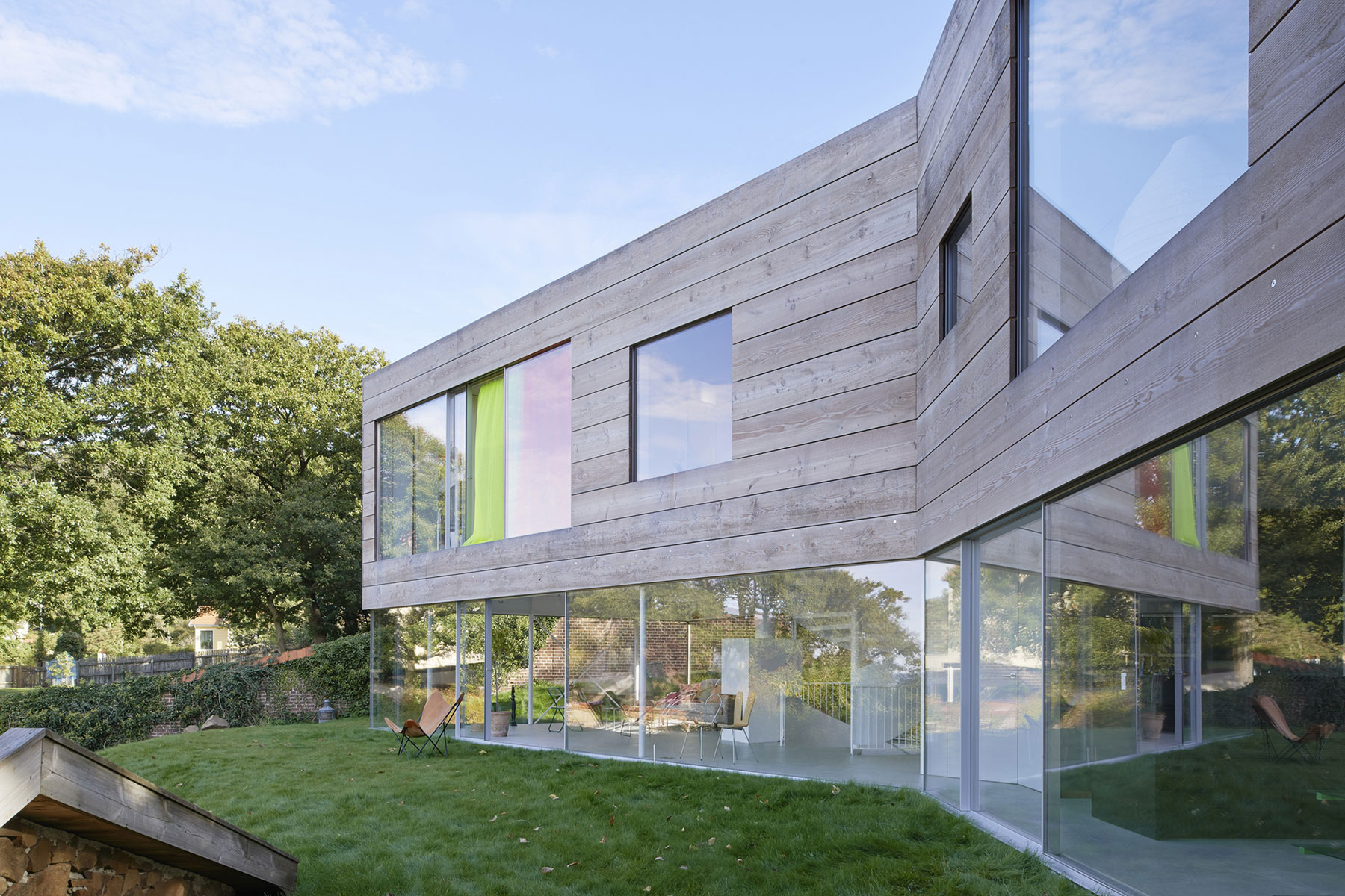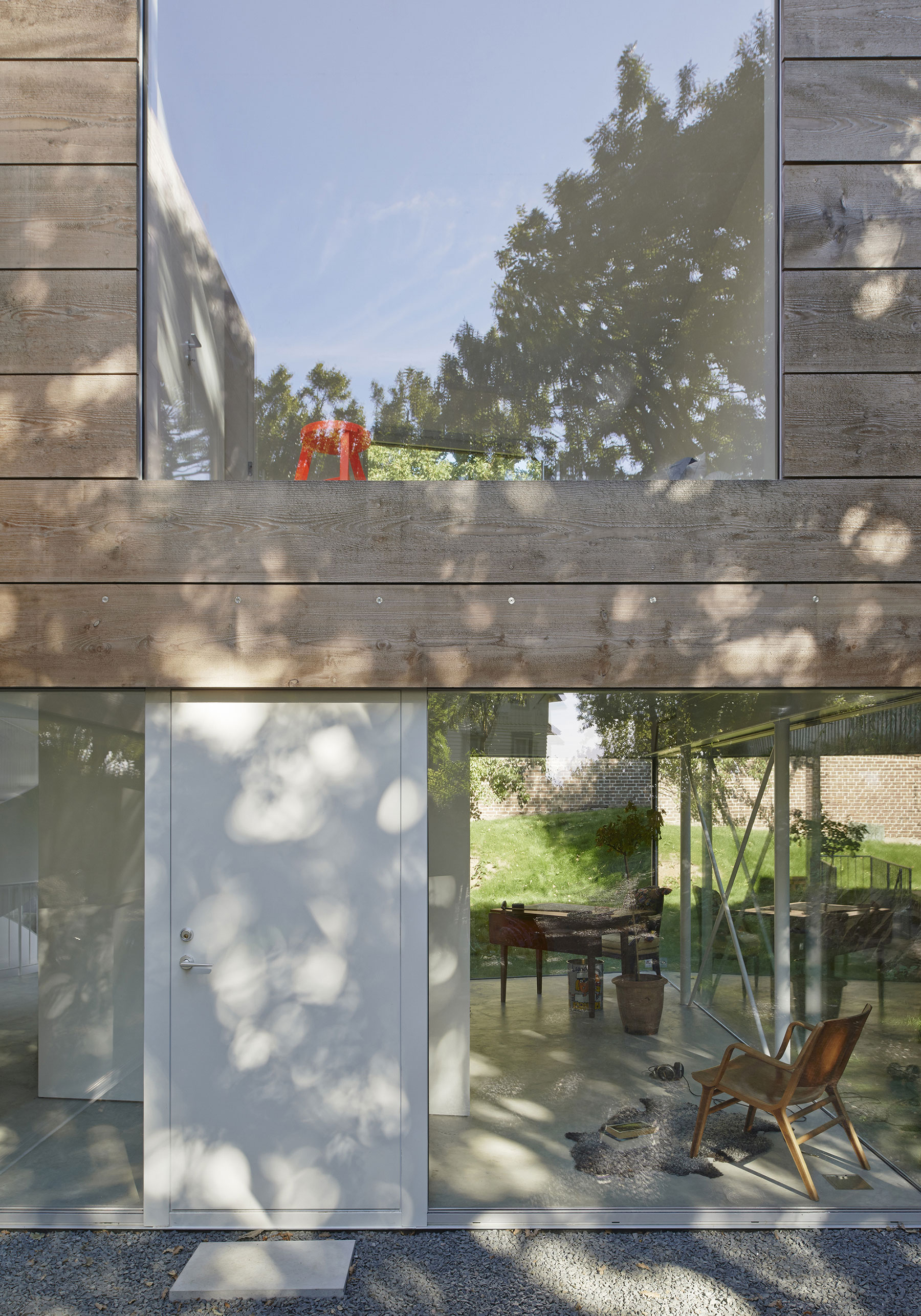 Kontrastným prvkom je použitie ľahkej zasklenej fasády na prízemí, ktorá odhaľuje celý interiér, a dreveného obkladu na prvom podlaží – ten je vytvorený z horizontálne uložených nadrozmerných dosiek z douglasky (druh ihličnanu, pozn. red.) a obaľuje nadzemné podlažie spolu s veľkými štvorcovými oknami. Celá konštrukcia stojí na štíhlych oceľových stĺpoch.
