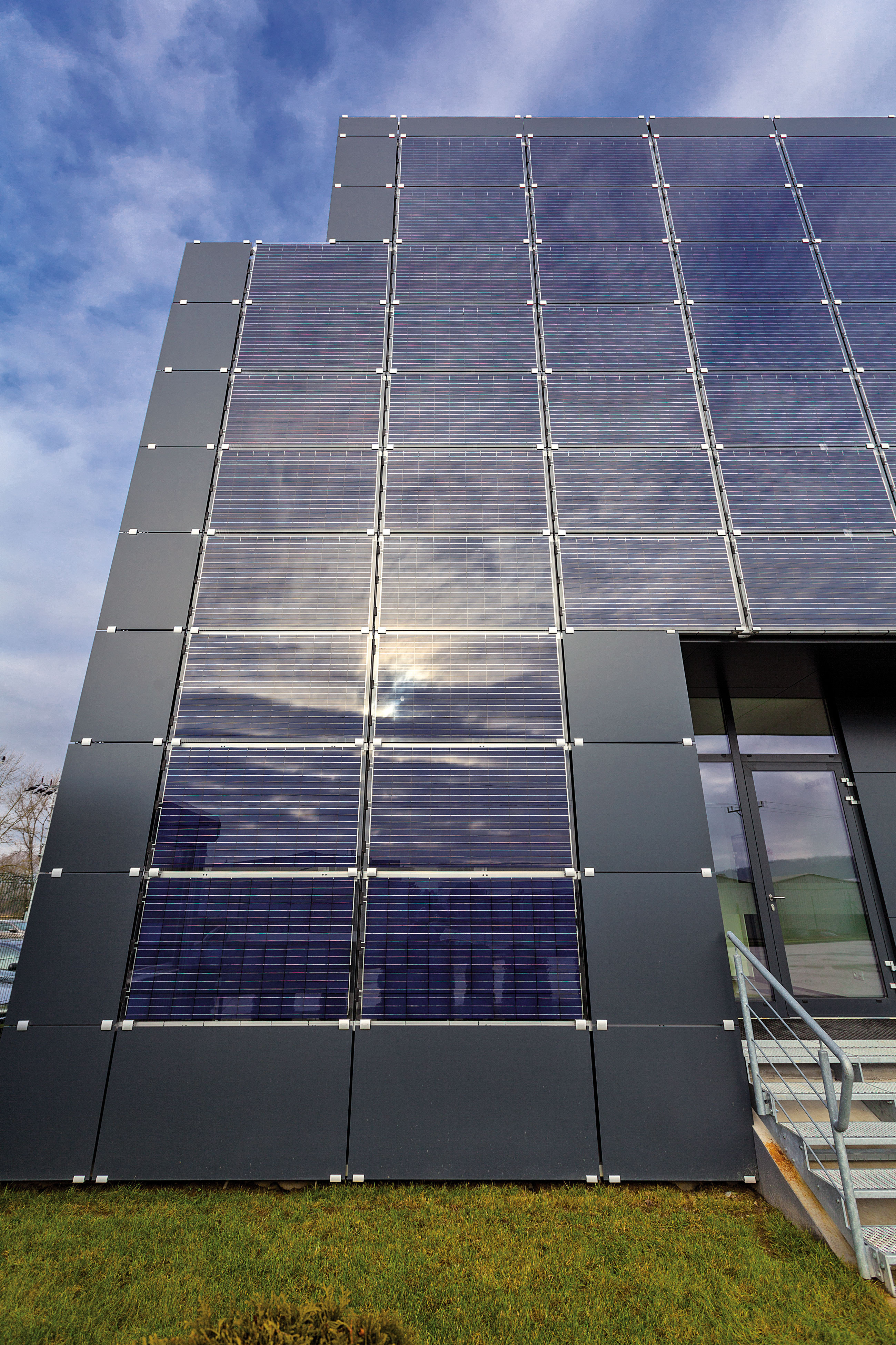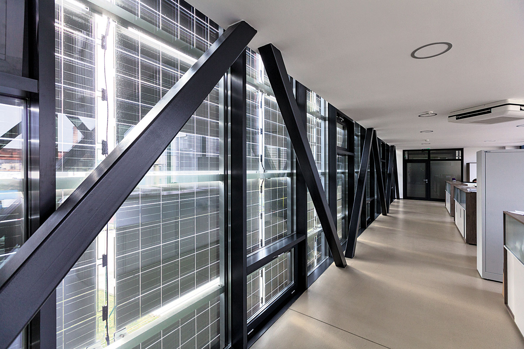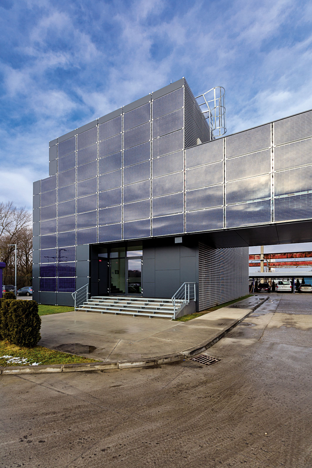 Dôležitým kritériom, ktoré dalo administratívnej budove charakteristický výraz, bolo použitie bezúdržbovej fasády. Mala byť dlhodobo stabilná a vydržať bez nutných opráv niekoľko desaťročí. Prekvapením je, že návrh fasády nie je výsledkom architektonickej kompozície, ale podrobných strojárenských výpočtov a maximálneho využitia orientácie na svetové strany. O to viac poteší výsledok, ktorý je vyvážený, lahodí oku a navyše je nadčasový. Južnú stranu objektu vrátane premostenia pokrývajú na fasáde fotovoltické panely s pevným rozmerom 1,2 m x 1,6 m. Sú ukotvené na pomocnej hliníkovej konštrukcii na špeciálnych hliníkových príchytkách. Panely vyrábajú elektrickú energiu, ktorú majiteľ dodáva do distribučnej siete. Panelmi je pokrytá maximálna plocha južnej fasády a sú nainštalované aj na streche premostenia. Kancelárie v premostení sú presvetlené so severnej strany cez veľkoplošné okná s trojitým izolačným zasklením, pričom z juhu im príjemne tienia práve fotovoltické panely. Ostatné časti južnej fasády, na ktoré nebolo možné použiť typizované panely, sú pokryté kompozitovými platňami.