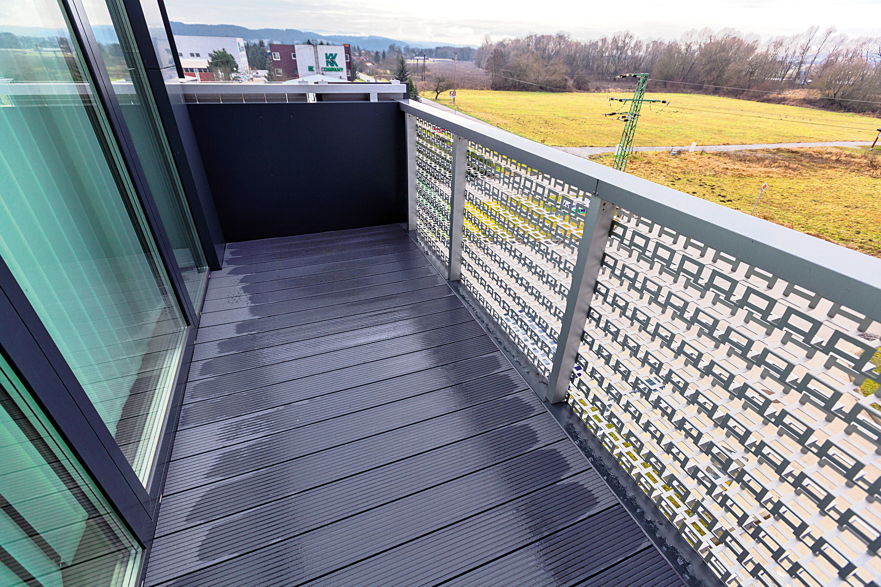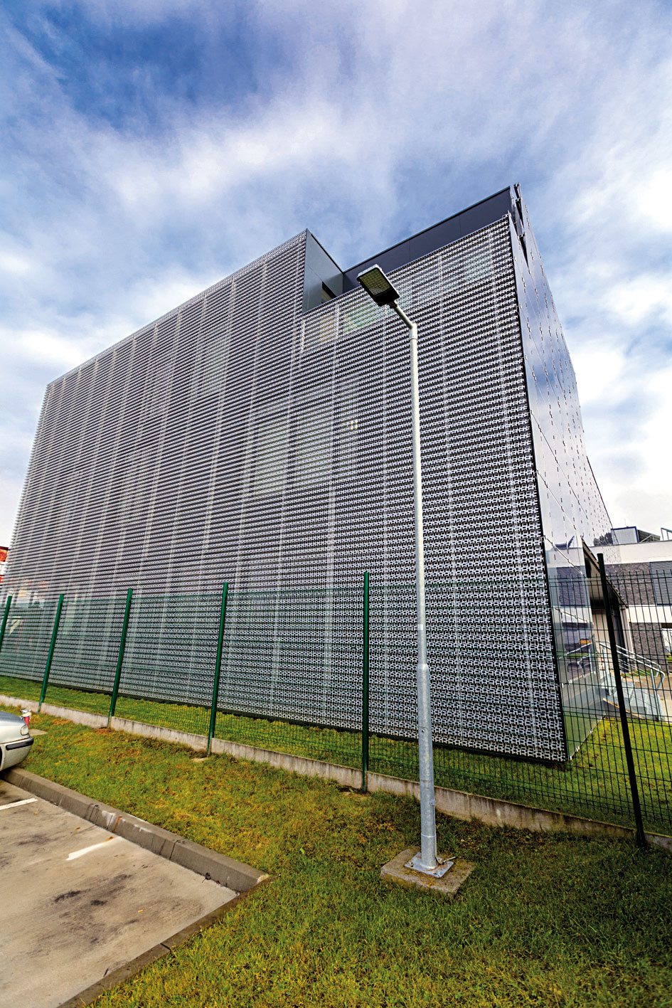 V exteriéri majú platne farebným náterom v antracitovom odtieni upravený plech s hrúbkou 0,5 mm. Z vnútornej strany platne je hliníkový plech a stabilitu dodáva platni jadro s hrúbkou 3 mm. Užitočným detailom sú zapracované okraje kompozitových platní, takže aj pri pohľade zblízka ide o elegantné riešenie. Výhodou je, že v prípade poškodenia sa dajú jednotlivé platne ľahko vymeniť. Z príjazdovej cesty hneď na prvý pohľad zaujme grafický motív na ostatných fasádach. Ide o trapézový hliníkový profil s perforáciou a eloxovou povrchovou úpravou. „Na fasády sa používa aj ťahokov, ale siahli sme po kvalitnejšom materiáli, aby sme dosiahli požadovanú bezúdržbovosť.“ Zvláštnosťou je, že perforovaný profil pokračuje aj tam, kde sú balkóny, a slúži tak ako originálne zábradlie. Táto fasáda je cez pomocnú hliníkovú konštrukciu ukotvená až do nosnej konštrukcie. Tepelné mosty boli ošetrené špeciálnymi plastovými podložkami.