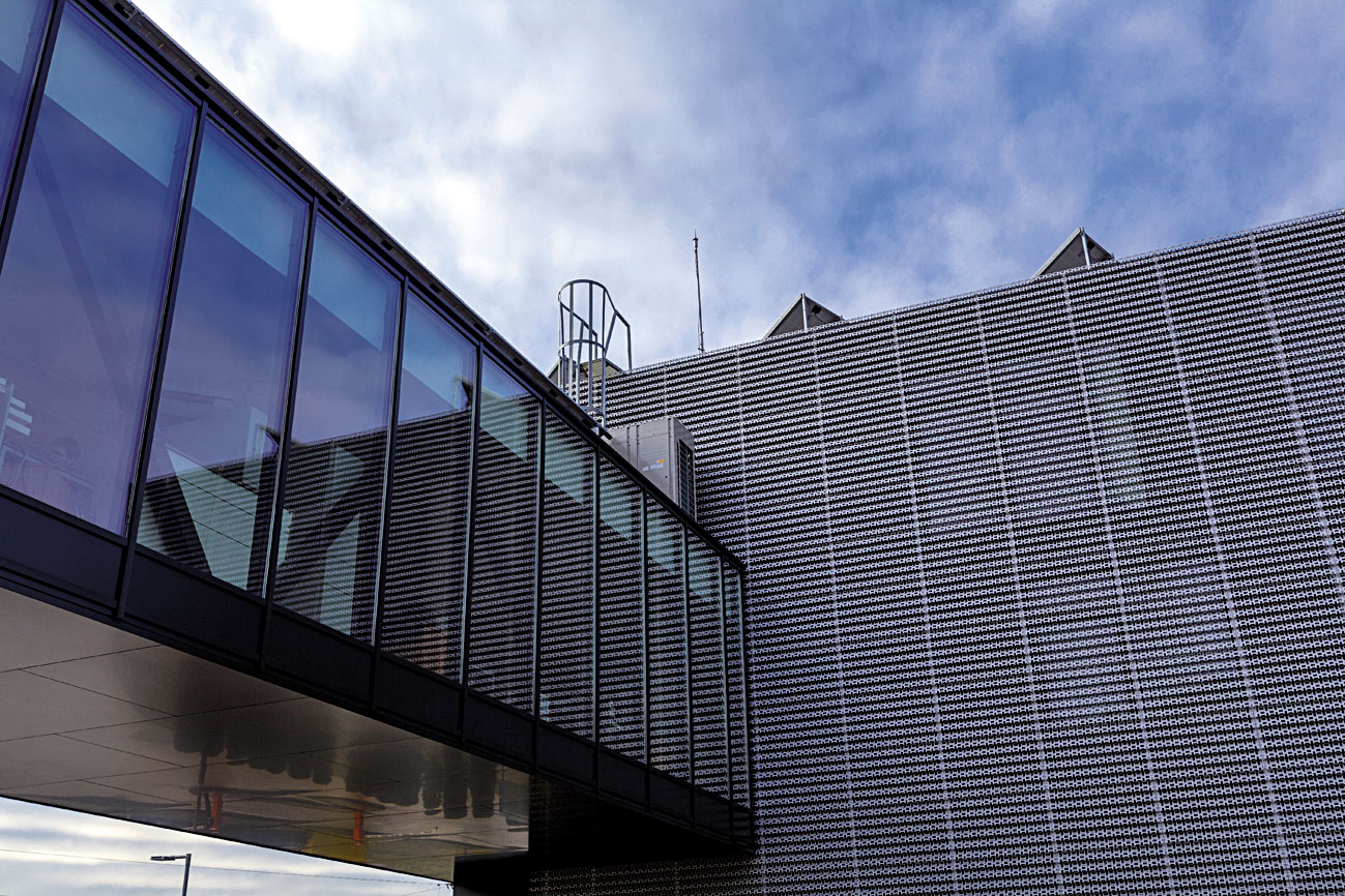 Jednoliatosť fasády podčiarkuje využitie perforovaného plechu aj vo funkcii zábradlia. Sympatický, pekne konštrukčne vyriešený detail.