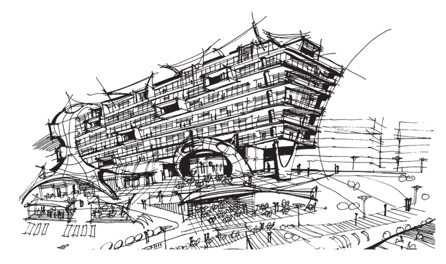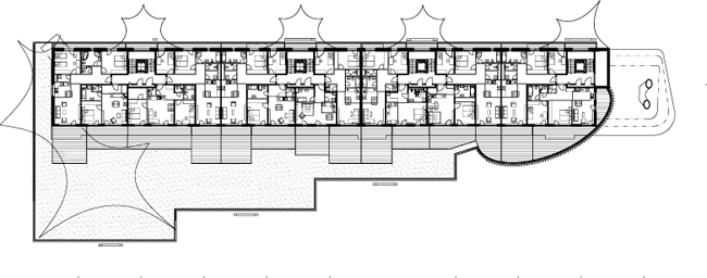 Podobné vysvetlenie prináša architekt aj v súvislosti s vejárom terás rozprestretým na východnej fasáde. „Na tejto slnečnej južnej strane sme budúcim obyvateľom chceli poskytnúť mimoriadny zážitok z výhľadu do okolia. Smerom odspodu hore sme postupne terasy tak, aby kopírovali oblúk Chorvátskeho ramena.