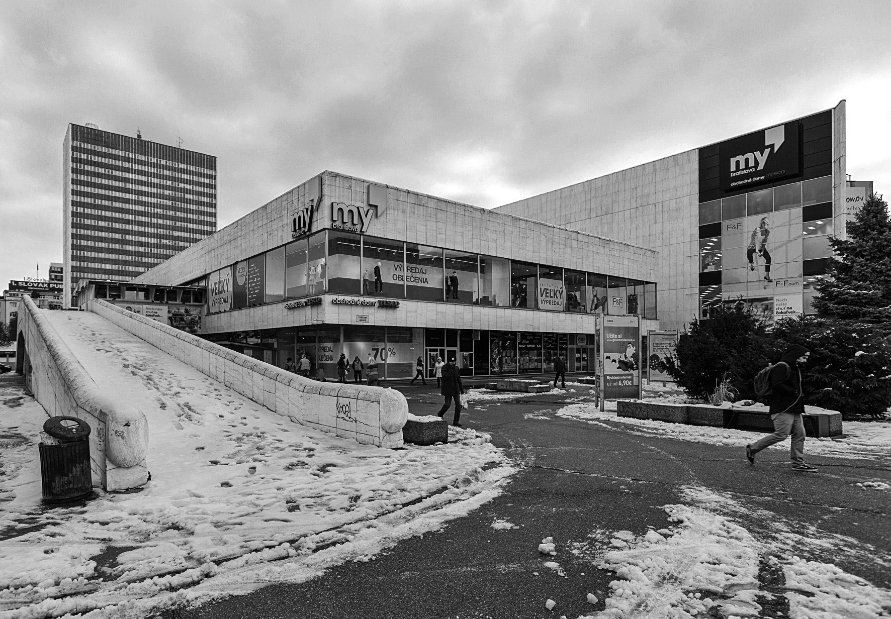 Na základe víťazstva v súťaži v roku 1960 vypracoval vtedy mladý architekt Ivan Matušík (1931) so spolupracovníkmi projekty troch etáp výstavby hotela Kyjev (1968 – 1973) a obchodného domu Prior (1964 – 1968) na bratislavskom Kamennom námestí. Komplex pozostáva z trojbokej hmoty obchodného domu spojenej krčkom so spoločnou horizontálnou podnožou a vertikálnou doskou hotela. Po prvý raz na Slovensku sa tu uplatnili veľkorozponové konštrukcie – monolitický skelet 9 x 9 m s trojuholníkovým konštrukčným pólom 60°. Typickým znakom je harmónia klasickej symetrie so zreteľnými asymetrickými vybočeniami. Pamiatkový úrad SR pred dvomi rokmi rozhodol, že komplex nevyhlási za národnú kultúrnu pamiatku, a preto nový majiteľ pozemkov chce celé územie revitalizovať. Až potom sa ukáže, čo bude aj s týmito objektmi.