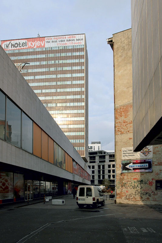 Po roku 1989 sa budova hotela Kyjev stala korisťou striedajúcich sa priekupníkov, špekulantov, a žiaľ, nie hoteliérov. Gamblerská herňa, ktorá nahradila konzumné strediská, roky ničila nielen hotelové interiéry, ale i ulicu. Ako je všeobecne známe, komplex budov na Kamennom námestí sa po bratislavskom Krematóriu radí k najvýznamnejším dielam modernej slovenskej architektúry sedemdesiatych rokov 20. storočia. Či uspeje podnet DOCOMOMO dať i tomuto dielu štatút národnej kultúrnej pamiatky, ukáže budúcnosť. Je to v kompetencii Pamiatkového úradu SR a ministerstva kultúry. Zdevastovaný a umŕtvený hotel Kyjev by však už dnes potreboval obnovu. Život obchodno-spoločenského centra sa nemôže obmedziť len na prevádzku obchodného domu. Špitálska ulica ako hlavná mestská radiála v celkovej dĺžke tisíc metrov si takisto žiada úpravy súvisiace s dynamickou, statickou i hromadnou dopravou. Zobytnenie ulice si vyžaduje nové stromoradie a komplexný uličný dizajn. V súčasnosti dozrievajú podmienky na to, aby vzácna lokalita priliehajúca k Námestiu SNP dostala novú tvár. Moje modelové stvárnenie z roku 2012 sa neobmedzuje len na plánované podzemné garáže. Nad nimi musí dominovať originálne architektonické dielo zodpovedajúce duchu 21. storočia.”