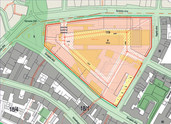 Túto verziu už dlhodobo diskutujeme so zástupcami kompetentných inštitúcií. Za veľmi osožnú považujeme diskusiu s hlavnou architektkou mesta Ingrid Konrad, ktorá upriamila pozornosť na tému verejných priestorov. Definovali sme štyri základné priestory, z ktorých každý má vlastný charakter. Ide predovšetkým o samotnú prednú časť námestia: de facto ukončenie Námestia SNP, pozicionovanie Špitálskej ulice ako malého mestského bulváru s osobnou a mestskou hromadnou dopravou, stvárnenie Dunajskej ulice ako pokojnej obytnej štvrte a Rajskej s vyústením Cintorínskej, ktoré môže byť druhým vstupným bodom do mestského bloku. Nechýbajú, samozrejme, prepojenia na existujúce pasáže a určite chceme do budúcnosti uvažovať o ďalších nových pasážach a podzemných prepojeniach, ktoré by zatraktívnili mesto a priniesli viac života.
