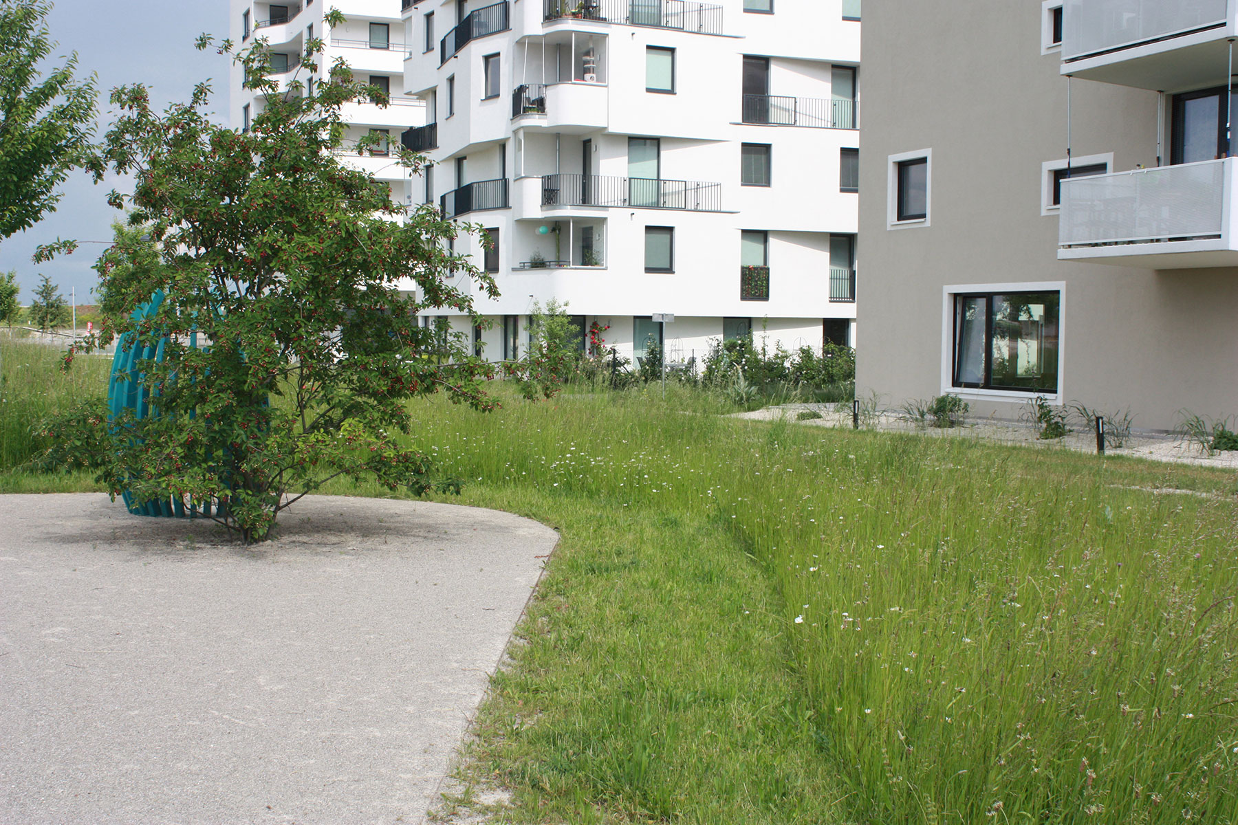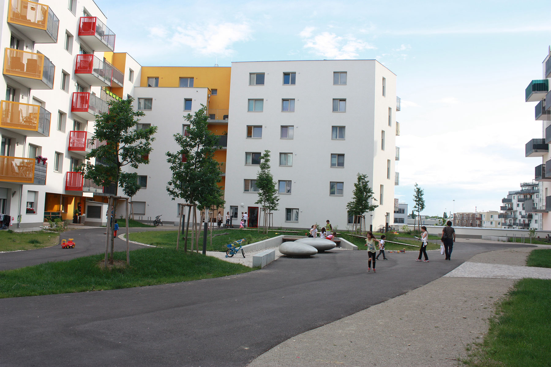 Dôraz na hru / sa tu odráža v exteriéri v diverzite hracích zón. Hracie prvky aj pre staršie deti a dospelých (šmykľavka). Hojdačky na každom kroku, aj vo ,,zvyškovom“ priestore na rohu budovy. Každý m2 je využitý účelne, každý z vnútroblokov je unikátny, má odlišný charakter, je špecifický iným typom vybavenia verejného priestoru. Parku v západnej časti developmentu Aspern Seestadt Yella-Hertzka-Park dominuje sviežo hravá platforma multifunkčného ihriska s amfiteátrovým sedením, inému vnútrobloku zas dominuje u nás zaznávaný asfaltový povrch dráhy pre malých cyklistov.