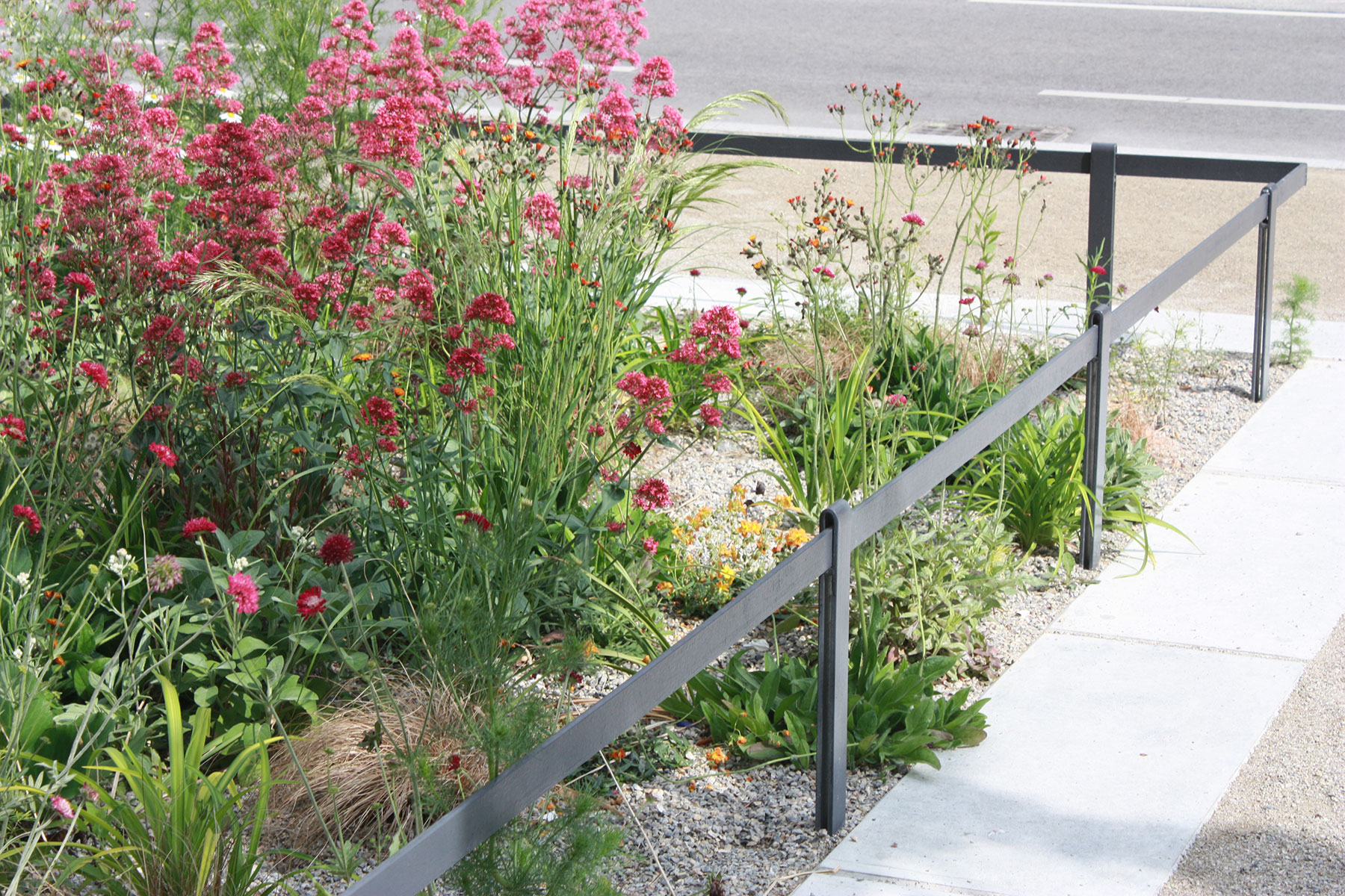 Prechod medzi verejným a súkromným priestorom / musí byť jasný, tak pochopíme, že ho nemožno devastovať. Edges alebo hrany betónových lavičiek jasne vravia, kde sa začína pozemok toho druhého bez potreby nezmyselne oplocovať.