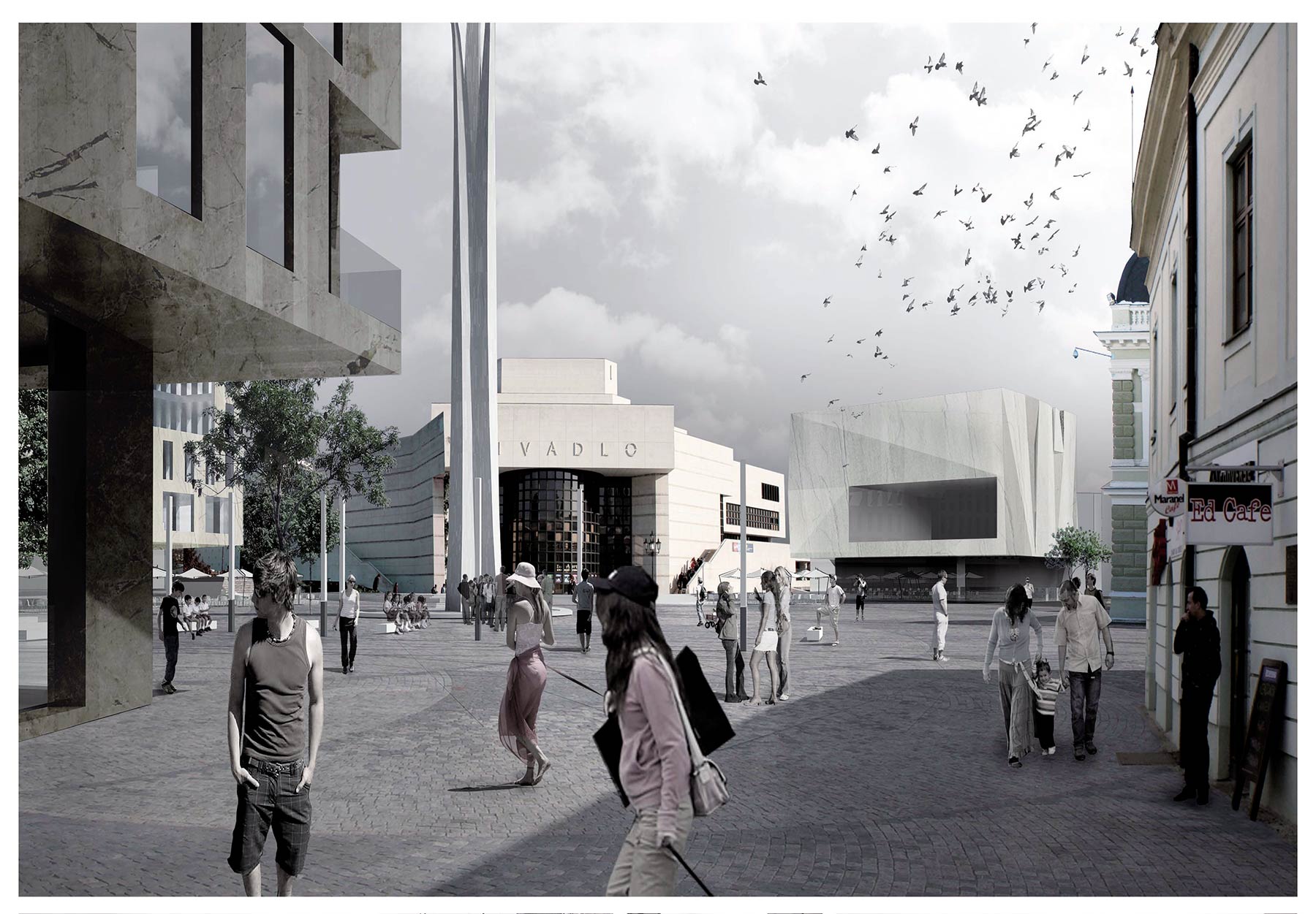 Ďalšou inštitúciou, ktorá dopĺňa pojem kultúrneho fóra, je galéria. V súčasných podmienkach môže galéria ako multimediálne umelecké prostredie významne animovať život mesta. Svoje predpolie môže systematicky napĺňať rôznymi expozíciami, projekciami a aktivitami. Je aj prirodzeným miestom pre tvorivé dielne detí, profesionálnych výtvarníkov či amatérov – obyvateľov mesta. Obytný dom navrhnutý v dotyku s existujúcim blokom domov uzatvára enklávu bývania v kontakte s priestorom námestia. Nový obytný objekt zároveň vytvára plnohodnotné domoradie na východnej strane od divadla. Vzhľadom na význam všetkých potenciálnych nových budov v kontakte so Svätoplukovým námestím navrhujeme, aby sa v budúcnosti vypísali verejné anonymné architektonické súťaže na stvárnenie týchto objektov.