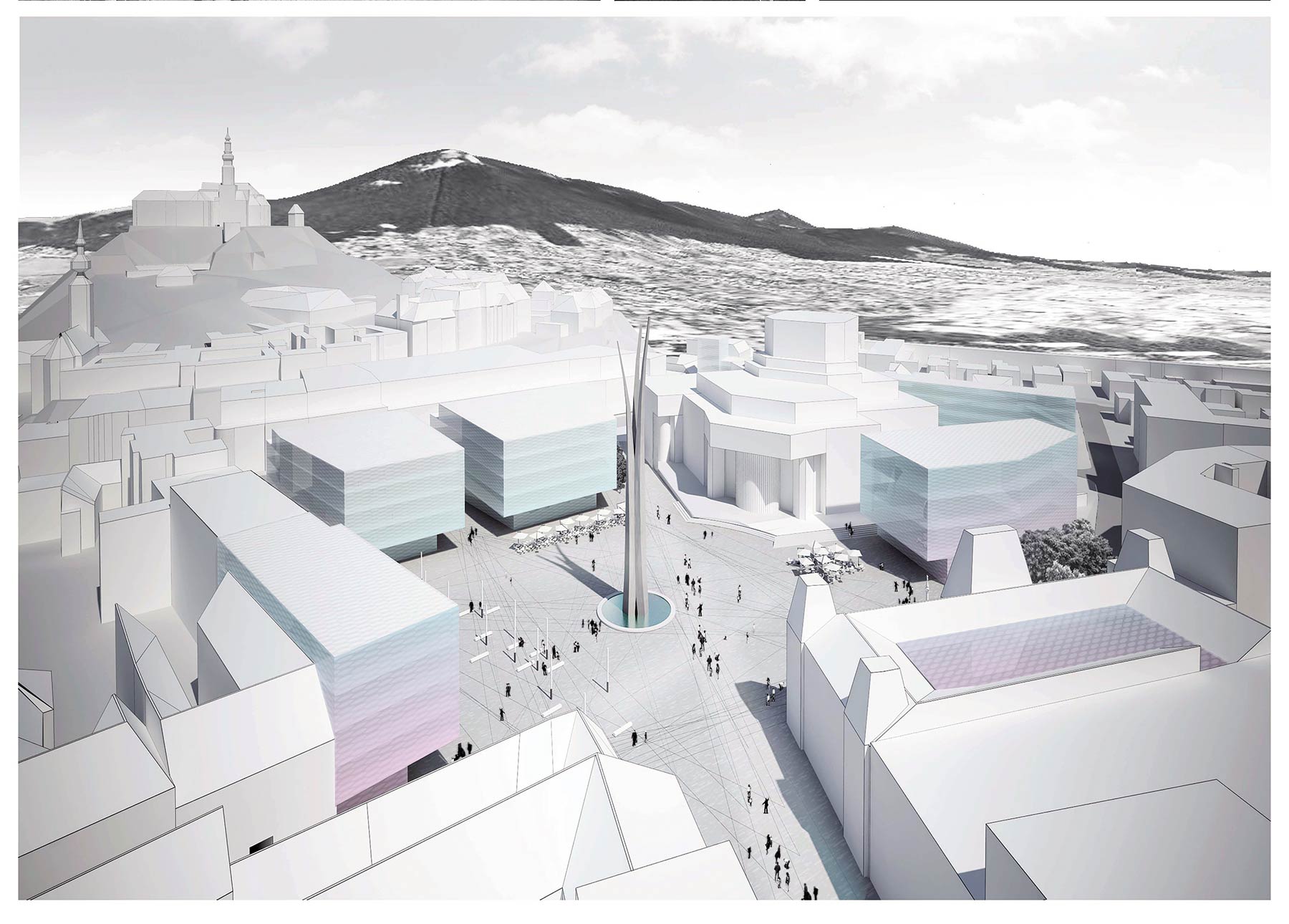 Architektonické objemy nových objektov korigujú mierku námestia a vytvárajú prirodzené prepojenie s okolitým mestom, do ktorého vrastajú a spájajú sa s ním. Objekty svojimi hmotami definujú nové ulice, ktoré vychádzajú z námestia a otvárajú urbanistické priehľady zo Štefánikovej ulice a z námestia na Horné mesto a na Zobor. Zároveň ponechávajú pohľady na niektoré významné solitéry – hrad, Kostol sv. Petra a Pavla či Veľký seminár – s ktorými sa touto formou opticky spájajú a identifikujú.
