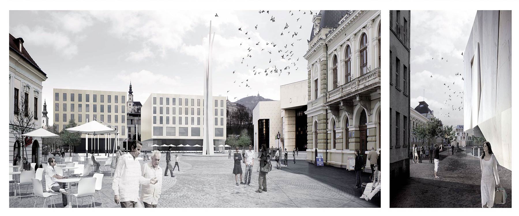 Hlavným cieľom súťažného návrhu je vytvorenie plnohodnotného mestského prostredia s primeranou ľudskou mierkou a s vybavením kvalitnými prvkami mobiliára a bezbariérovými úpravami terénu. Autorský kolektív prináša podnety a impulzy na priestorové doplnenie námestia a jeho okolia so zámerom vytvoriť pre obyvateľov a návštevníkov mesta harmonické prostredie s prirodzeným napojením na existujúce verejné priestory. V koncepte námestia sú čitateľné priame ideové aj kompozičné vzťahy exteriérového priestoru a divadla.