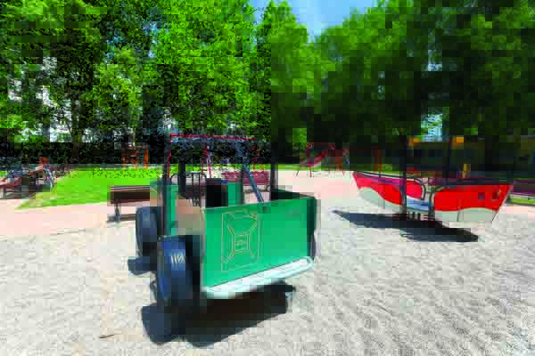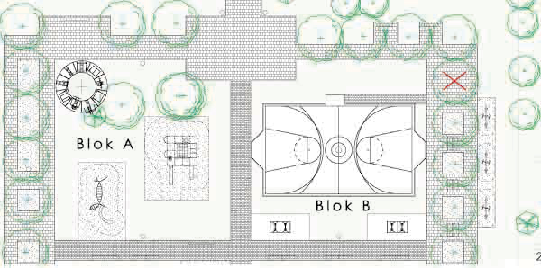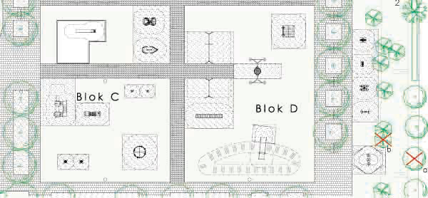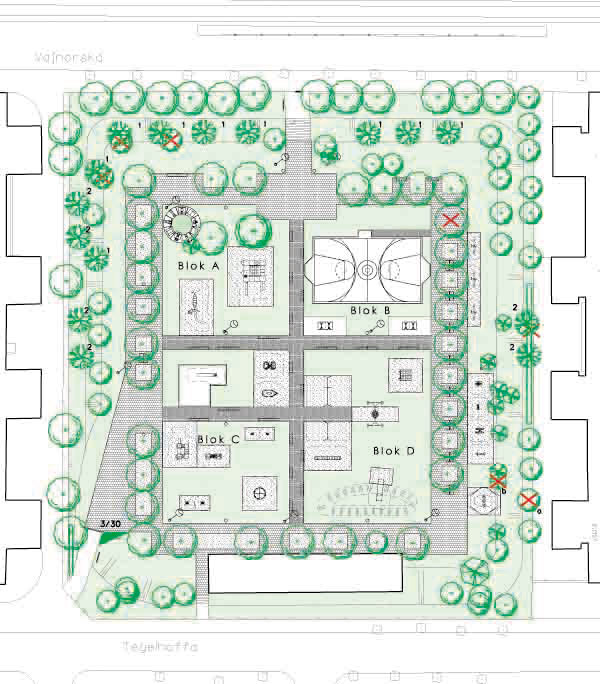 „Snažili sme sa vyhnúť kolízii rôznych vekových kategórií detí, preto sme priestor rozdelili na 4 bloky A, B, C, D. Pri hlavnom vstupe je zámerne umiestnený Blok C pre deti od 2 do 6 rokov, aby mali mamičky s kočíkmi čo najjednoduchší prístup. Na blok C nadväzuje blok D pre vekovú kategóriu od 6 do 15 rokov s fyzicky náročnejšími zostavami. Jeho zaujímavosťou je umelý kopec so šmykľavkou. Lákadlom sú dve multifunkčné zostavy (hrady), ktoré deťom umožňujú rôzne herné činnosti na jednom mieste. V bloku B sú dva pingpongové stoly a multifunkčná aréna pre mládež. Centrálna zostava na cvičenie v prírode je v bloku A. Všetky štyri bloky obklopuje promenádny chodník,“ objasňuje architekt Kosman. Pozdĺž neho autori situovali prvky na cvičenie pre dospelých. Osadenie medzi stromami vytvára dostatok súkromia.
