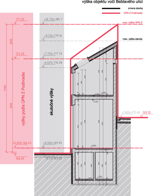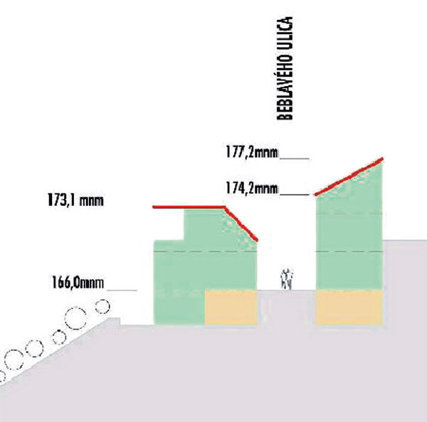 Z logiky veci vyplýva, že keď opravené výšky terénu poskočili, mali by poskočiť na reálnu hodnotu aj regulatívy výšky ríms a hrebeňov striech. Magistrát nám o zaregulovanej výške objektu poskytol nasledovné vyjadrenie: „Maximálna povolená výška zástavby v regulačnej jednotke V22 je po výšku rímsy susedného objektu V23. Od tejto výšky rímsy sú priamo odvodené regulatívy – maximálna povolená výška zástavby a limit strešnej modelácie, ktoré sú stanovené v územnom pláne správne, nezávisle od kót terénu.“