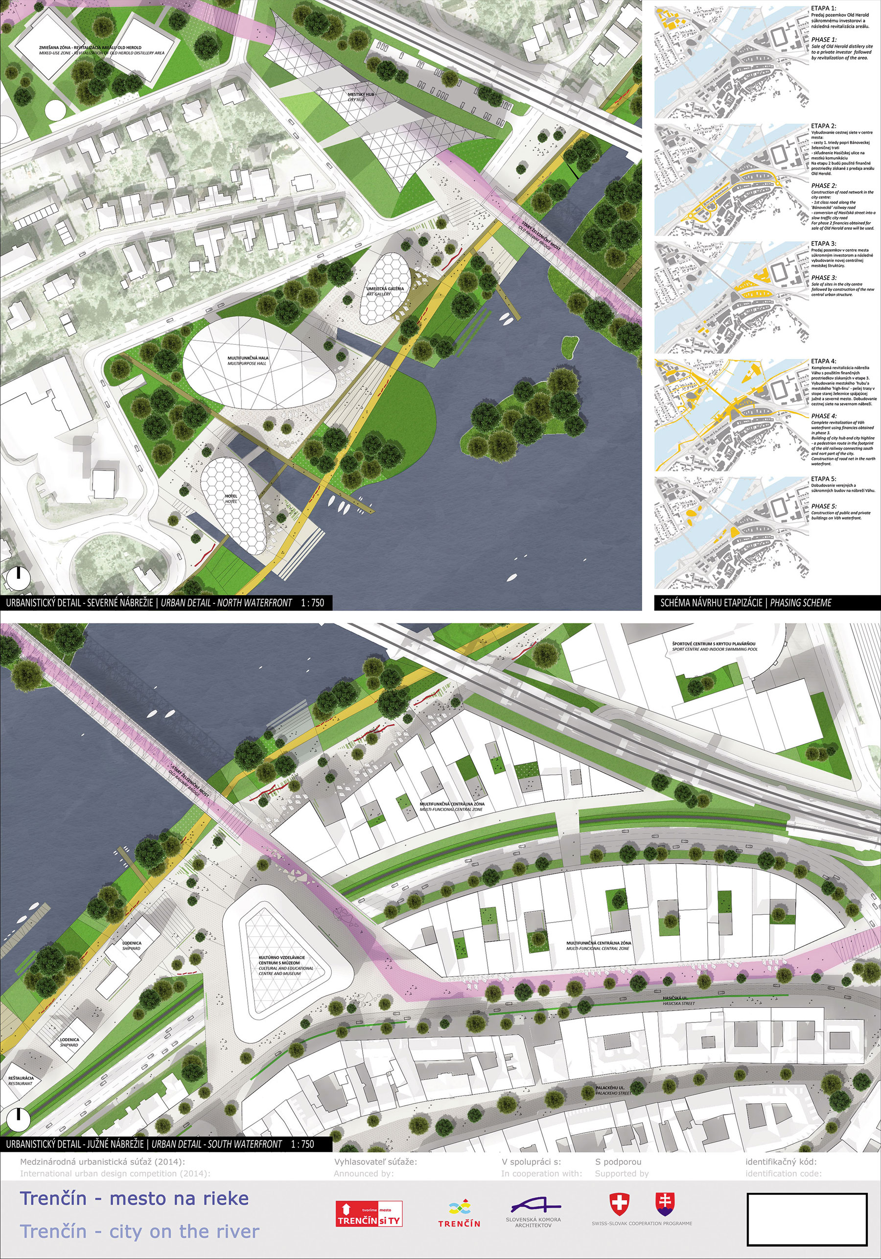 1. cena – táto idea napĺňa zadanie „mesto na rieke“, a to výrazným spojením mesta s riekou – na ľavom brehu primeranou urbanizáciou a na pravom brehu priamym spojením zástavby s riekou vo výškovej úrovni hrádze. Urbanistická štruktúra je v príjemnej mierke a proporcii reflektujúcej historickú zástavbu starého mesta. Hmoty novej zástavby vhodne kooperujú s voľnou štruktúrou tej historickej. Štruktúra nie je monotónna, primeranou, ale jemnou gradáciou vytvára prostredie, ktoré je pokorné vo vzťahu k starej existujúcej zástavbe, no pritom ekonomicky zaujímavé. Veľmi pozitívne hodnotíme prepojenie starého mesta so starým železničným mostom, kde sú jasne čitateľné dôležité trasy pohybu ľudí, zároveň je okolie týchto trás urbanizované centrotvornými funkciami, ako sú kultúrno-komunitné centrum, tržnica, hotel a konferenčné centrum. Vytvorenie zálivov okolo nového železničného mosta však pôsobí negatívne, takéto prírodné prostredie pri železnici nevnímame ako vhodné – hlavne keď podobné prostredie môže vzniknúť oproti v alúviu. Dopravné riešenie odporúča jednoznačne zrealizovať juhovýchodný obchvat a odbremeniť dopravu v centre.