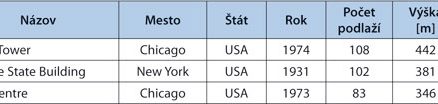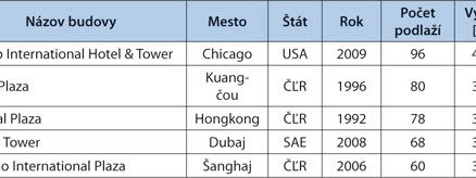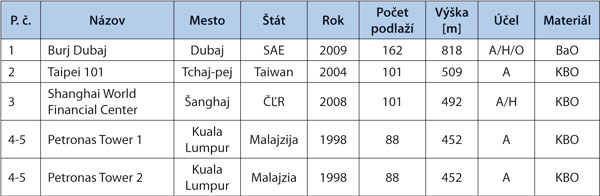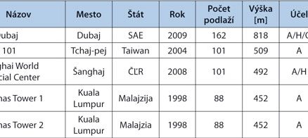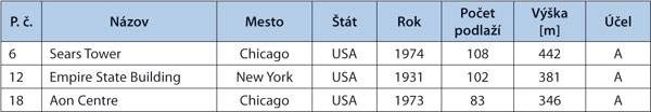 Tab. 2: Päť budov s oceľovou nosnou konštrukciou zoradených podľa výšky