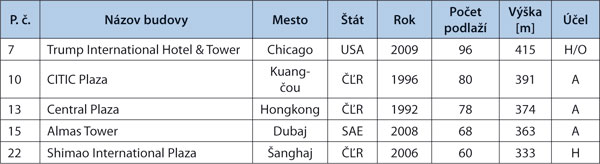 Tab. 3: Päť budov s betónovou nosnou konštrukciou zoradených podľa výšky