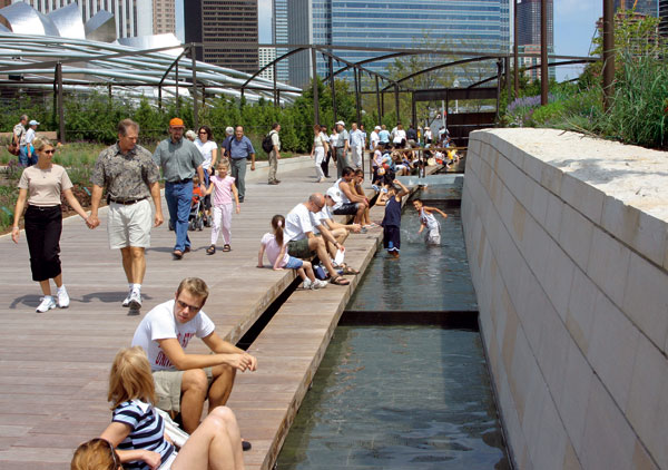 Botanická záhrada Lurie Garden sa dostala do spoločnosti prominentných susedov. Nad ňou sa týči striebristý Gehryho amfiteáter, ktorý je spleťou širokých oceľových stúh, a Pavilón Jaya Pritzkera, pod ňou budova Chicago Art Institute a jej nové krídlo, ktoré pre zmenu navrhol Renzo Piano. Na západnej strane parku návštevníkov víta lesklá tekuto pôsobiaca skulptúra Cloud Gate od sochára indického pôvodu žijúceho v Británii, Anisha Kapoora. Domáci obyvatelia ju však pre jej obličkovitý tvar neformálne nazývajú fazuľa.
