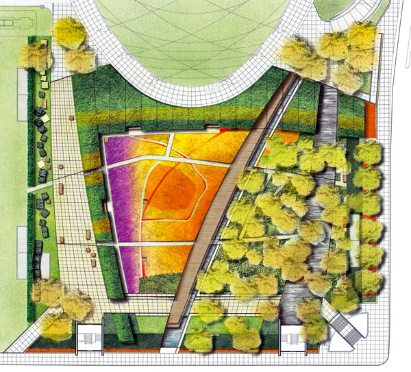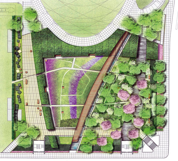 Obidve platne rozdeľuje drevená promenáda s úzkym kanálom. Vytvára úzku ryhu naprieč celou záhradnou kompozíciou. Jej situovanie má spojitosť s niekdajšími opornými múrmi, ktoré kedysi vybudovali medzi jazerom a súšou ako zábranu. Pre lepšiu nosnosť a odľahčenie podložia leží záhrada na EPS pene, ktorá sa prikryla zeminou.