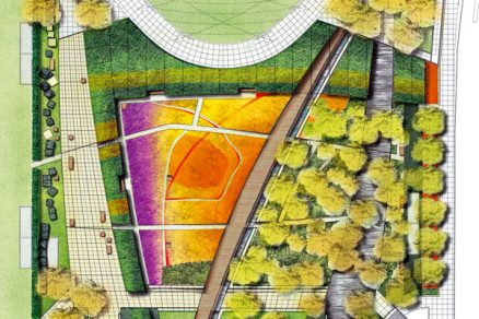Aj z toho dôvodu bolo treba vytvoriť nenásilnú ochrannú bariéru medzi amfiteátrom a záhradou. Parkom totiž v čase podujatí prechádzajú tisíce ľudí. Konštrukciu živého plota vytvára oceľový skelet. Ide o výstuž, ktorá pomáha vytvarovať niekoľko rastlinných druhov do ucelenej monumentálnej záhradnej formy. Zdanlivé ramená sú odkazom na Sandburgovu metaforu. V období vegetácie vyplní zeleň celú kostru skeletu. Samotná záhrada sa člení na dve základné časti, ktoré sa vo fragmentoch vyzdvihli nad úroveň pochôdznych plôch. Ide o takzvanú tmavú a svetlú platňu, ktoré predstavujú dve tváre mesta. V koncepte, založenom na umeleckom stvárnení dejinného vývoja Chicaga, sa výrazne prejavuje rukopis divadelného výtvarníka Roberta Israela. Jeho účasť na tvorbe projektu dokazuje, že medziodborová spolupráca môže podnietiť vznik zaujímavých diel.