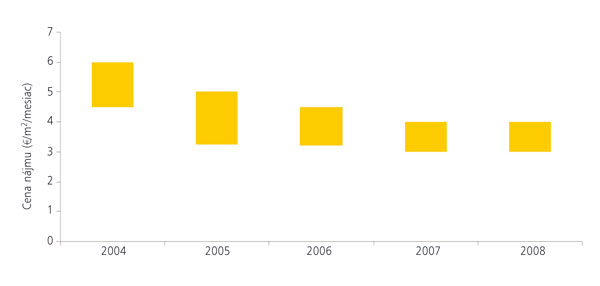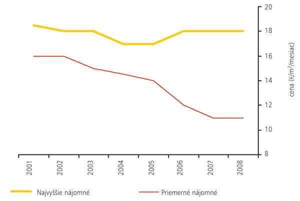 Na cenu týchto nehnuteľností vplýva predovšetkým lokalita, veľkosť, dĺžka kontraktu či meno klienta, ktorý si priestory prenajíma. V ostatných častiach Bratislavy sa ceny nájmu za moderné kancelárske priestory pohybujú od 290 do 400 korún (9,50 až 13 eur) za štvorcový meter mesačne. V iných slovenských mestách sú ceny o niečo nižšie. Závisia predovšetkým od dostupnosti, lokality, ponúkaného štandardu, dopytu a ponuky v danom meste. Výška mesačného nájmu sa pohybuje od 240 do 360 korún (8 až 12 eur) za štvorcový meter.“