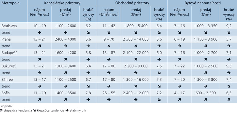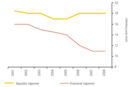 „V poslednom čase sme zaznamenali záujem developerov expandovať aj do ostatných slovenských regiónov, ale okrem niekoľkých lastovičiek sa nič veľké nestavia. Táto situácia ovplyvňuje aj ceny nájmov, ktoré sú v bratislavskom regióne paradoxne najnižšie. Rastúce ceny stavebných pozemkov a stavebných nákladov síce tlačia ceny nájmov hore, ale silnejúca konkurencia nedovolí výrazné zdražovanie. Na druhej strane absencia silnejšej konkurencie v iných slovenských regiónoch nemotivuje developerov znižovať ceny nájmov, pretože väčšina existujúcich projektov je plne prenajatá.“ Prieskumy spoločnosti Colliers International poukazujú na stabilnú priemernú výšku cien nájmov, ktorá osciluje medzi 100 až 108 korunami (3,4 až 3,6 eur) za štvorcový meter.