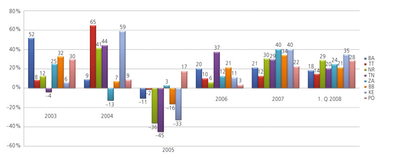 Medziročný pohyb cien nehnuteľností na bývanie podľa slovenských krajov (2002 až I. štvrťrok 2008)