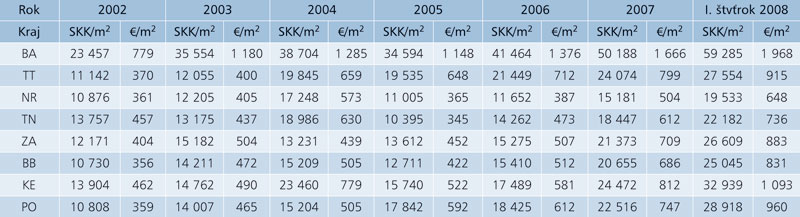 Ceny nehnuteľností na bývanie podľa slovenských krajov (2002 až I. štvrťrok 2008)