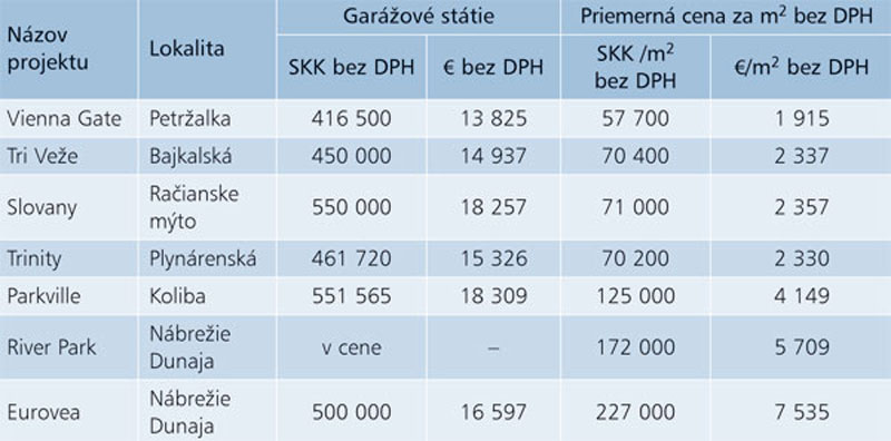 Podľa informácií Mateja Galatu, z rezidenčného oddelenia v spoločnosti CB Richard Ellis, patria medzi najdrahšie projekty v Bratislave nepochybne Eurovea, River Park na dunajskom nábreží, Parkville, Golden vineyards a Brečtanka na Kolibe; ďalej tu nájdeme City Gate, Dunajská, Panorama City a lukratívne mestské vily v Horskom Parku. „Pri všetkých projektoch sa cena za štvorcový meter bez DPH pohybuje od 80 000 do 250 000 korún (2 650 až 8 300 eur).“ Podľa Ivana Žideka zo spoločnosti Enright Development čaká Bratislavu cenová stabilizácia, pri ktorej by zhodnocovanie cien nemalo presiahnuť úroveň 5 až10 percent.