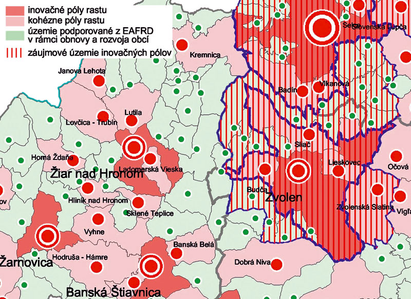 Ukážka klasifikácie obcí na inovačné a kohézne póly rastu.
