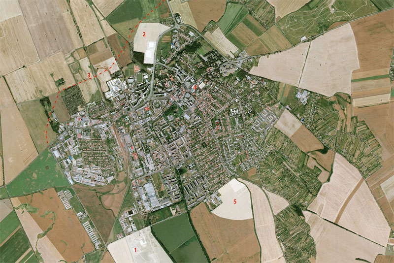 1 – Priemyselný park Levice-Géňa, 2 – lokalita pre rozvoj obchodných domov, 3 – severný obchvat Levíc, 4 – areál bývalých Žižkových kasární, 5 – lokalita na rozvoj bývania za obytnou časťou Rybníky