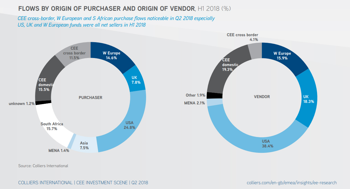Celkovo 26 % investovaných peňazí pochádzalo v prvom polroku 2018 z domácich alebo regionálnych cezhraničných zdrojov z krajín strednej a východnej Európy. Americké, britské a západoeurópske fondy boli v danom období čistí predávajúci komerčných nehnuteľností v strednej a východnej Európe. Táto situácia opakovala trend pozorovaný v rokoch 2016 a 2017.