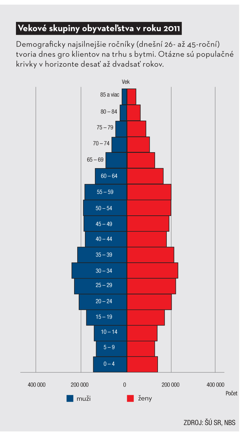 Z pohľadu developerov by toto mohla byť optimistická vyhliadka. Pri pohľade na demografický vývoj je vidieť, že počtom najsilnejšia generácia „Husákových“ detí sa dnes blíži do stredného veku. Pravdepodobnosť, že by baby boomom prekonala sama seba, je pri súčasnej pôrodnosti, keď na jednu ženu pripadá menej ako 1,5 dieťaťa, sporná. Možno nevieme presne, kto si dnes kupuje byty. Ale mali by sme sa viac sústrediť na poznanie skutočnej situácie na Slovensku.