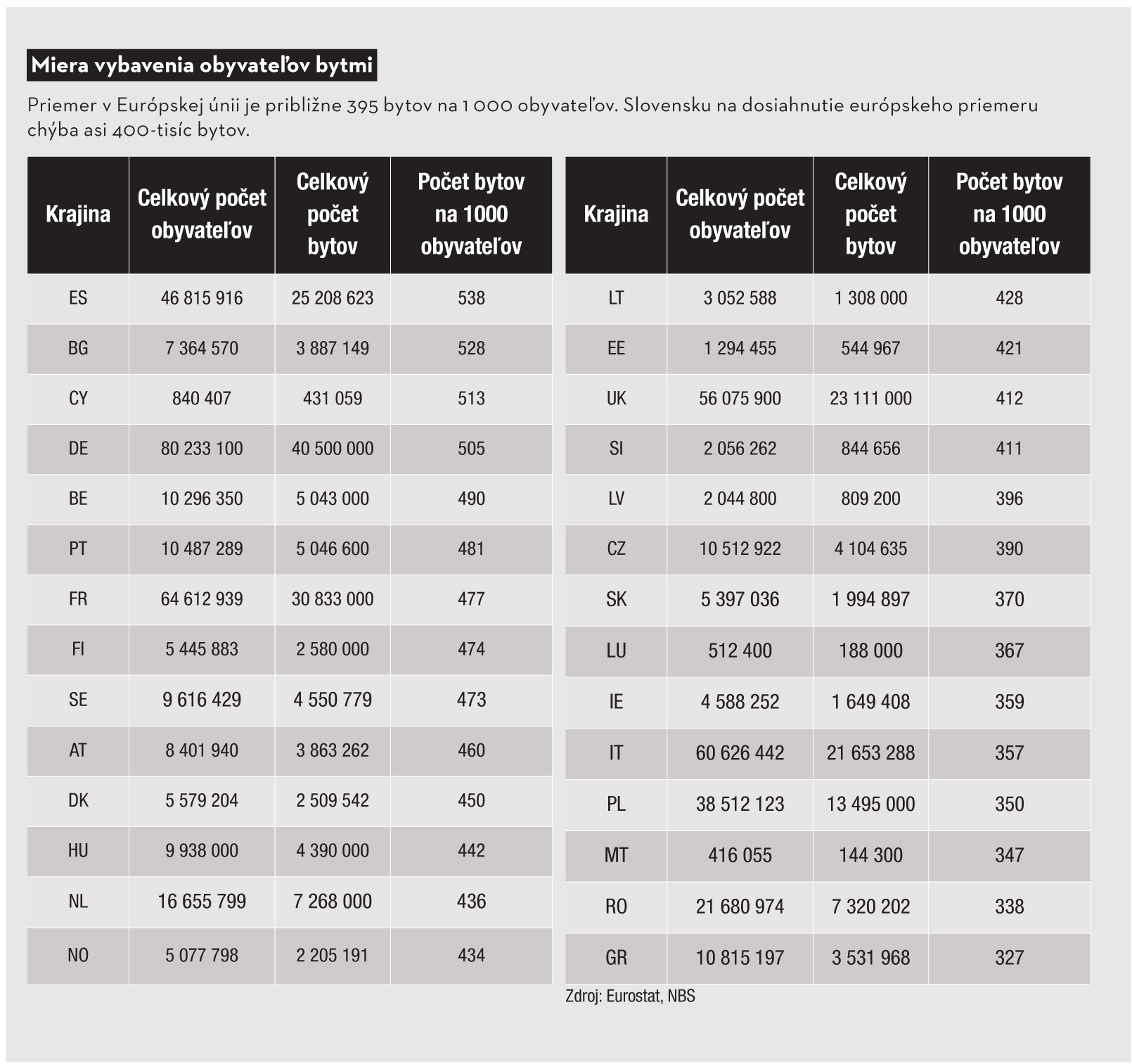 „Na dosiahnutie priemernej európskej vybavenosti obyvateľov obývanými bytmi (zhruba 395 bytov na 1 000 obyvateľov) by bolo potrebné podľa zjednodušenej úvahy mať v čase sčítania na Slovensku k dispozícii o takmer 400 000 funkčných bytov viac, t. j. spolu vyše 2,1 mil obývaných bytov oproti viac ako 1,7 mil. reálne obývaných bytov.