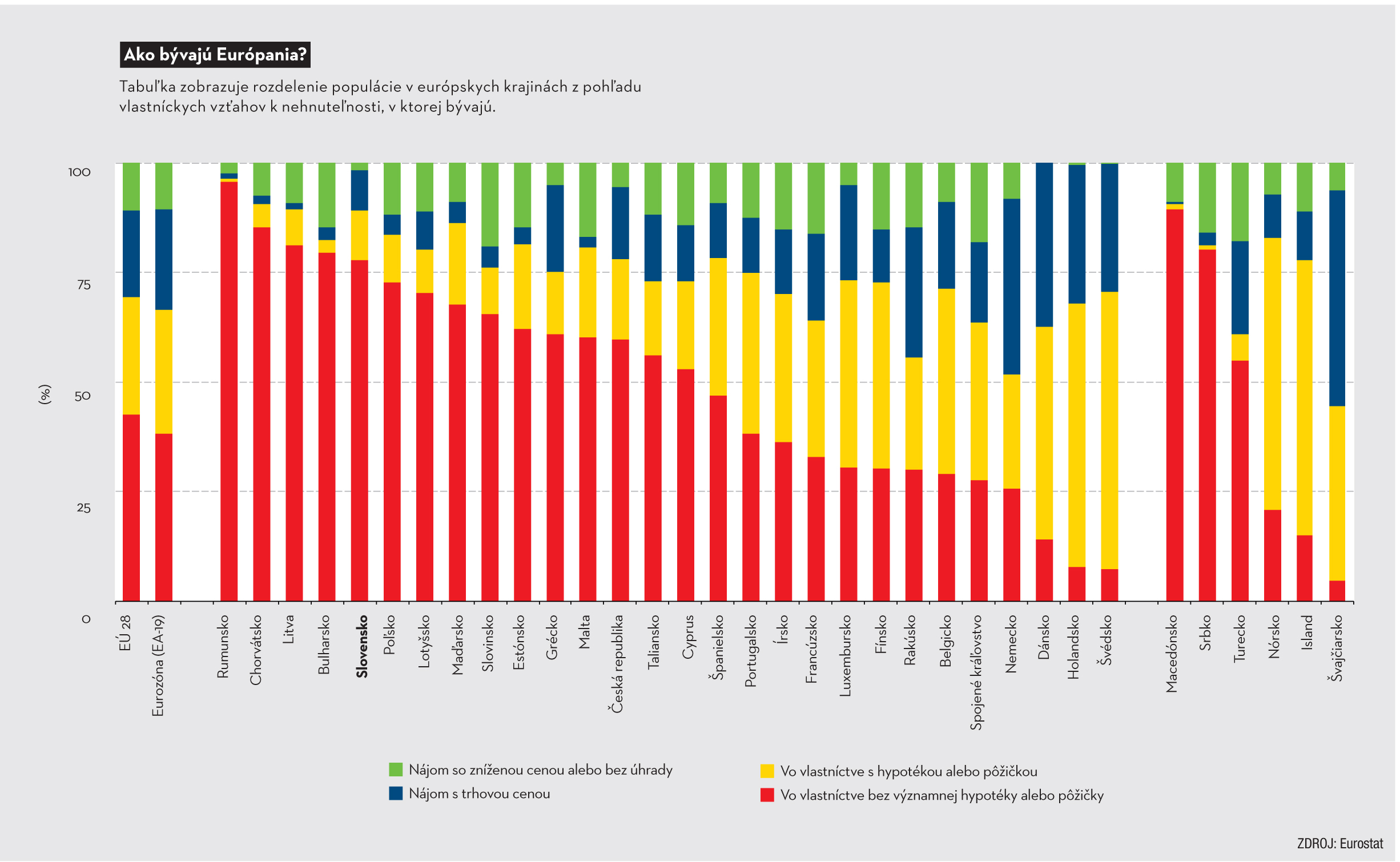 Fungujúci trh s nájomným bývaním, či už podporovaný štátom ako sociálny benefit, alebo na súkromnej báze vo forme nájomných domov, nie je na Slovensku investične atraktívna téma. Pri prognózach možného budúceho vývoja trhu s bytmi je niekoľko ukazovateľov. Neposkytujú však úplne jednoznačné indície. Budúcu flexibilitu mladej generácie sme už naznačili. Porovnanie Slovenska vo vybavenosti bytmi na počet obyvateľov ukazuje, že sme na chvoste krajín EÚ, v počte obývaných bytov dokonca úplne na konci.